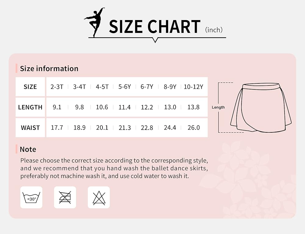 Chiffon wrap dance skirt for toddler girls available for 3-12 years old kid, Children can find the right size according to their age. The girls basic dance skirts are suitable for ballet dance class, jazz, latin, gymnastics exams, stage performances, Fancy Dress Party and daily life.