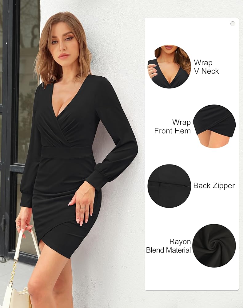 المميزات: رقبة ملفوفة على شكل حرف V / كم طويل منتفخ / حاشية أمامية ملفوفة / خصر إمبراطوري / سحاب خلفي مخفي / فستان مكشكش بطول فوق الركبة.