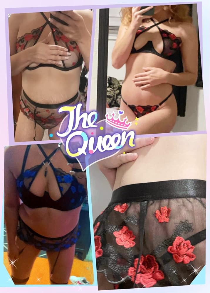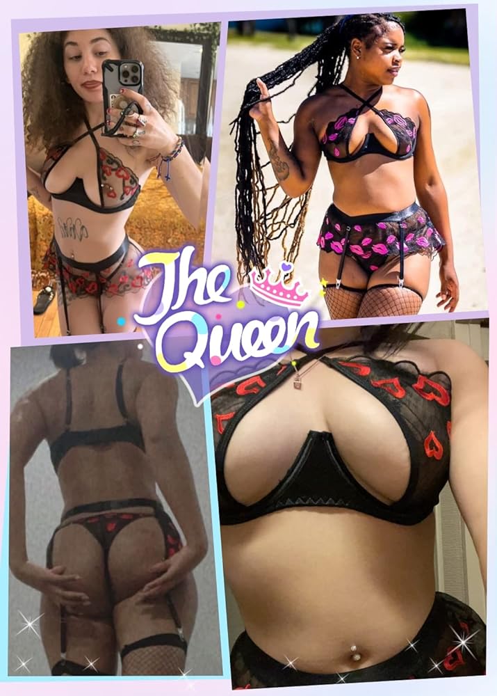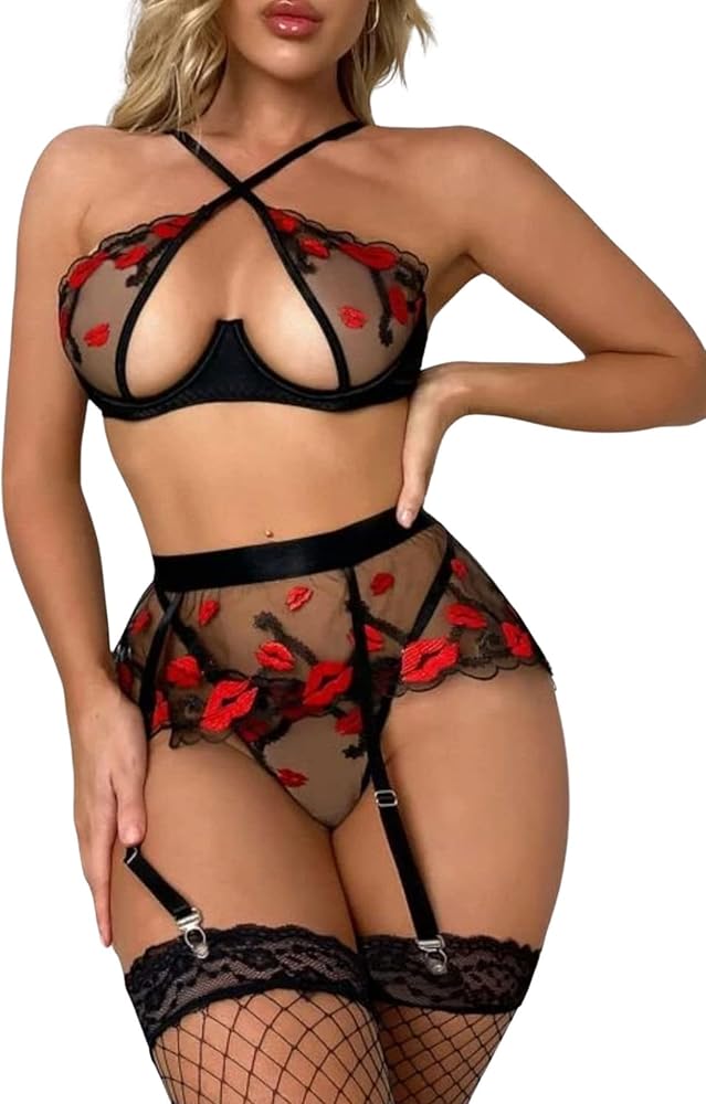ملابس داخلية نسائية مثيرة مطرزة بالشفاه من EVELUST - حمالة صدر بفتحة علوية وحزام رباط شبكي مكون من 3 قطع