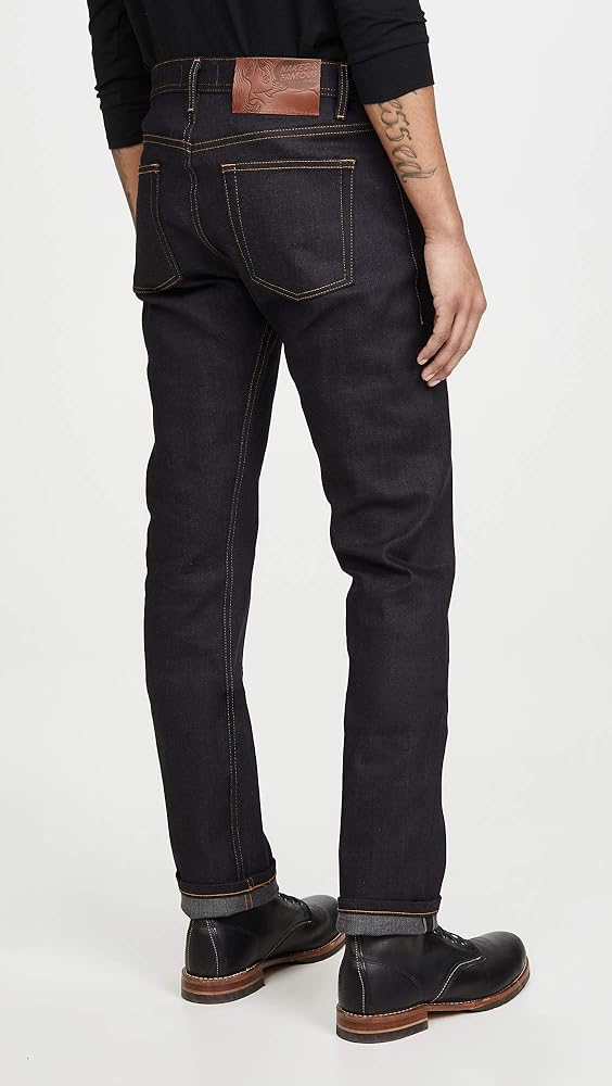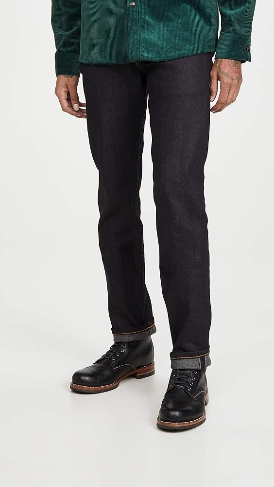 - جينز داكن اللون من قماش الدنيم السيلفي ايدج المرن مع خياطة متباينة وجيوب خلفية نظيفة؛ سحاب مع زر