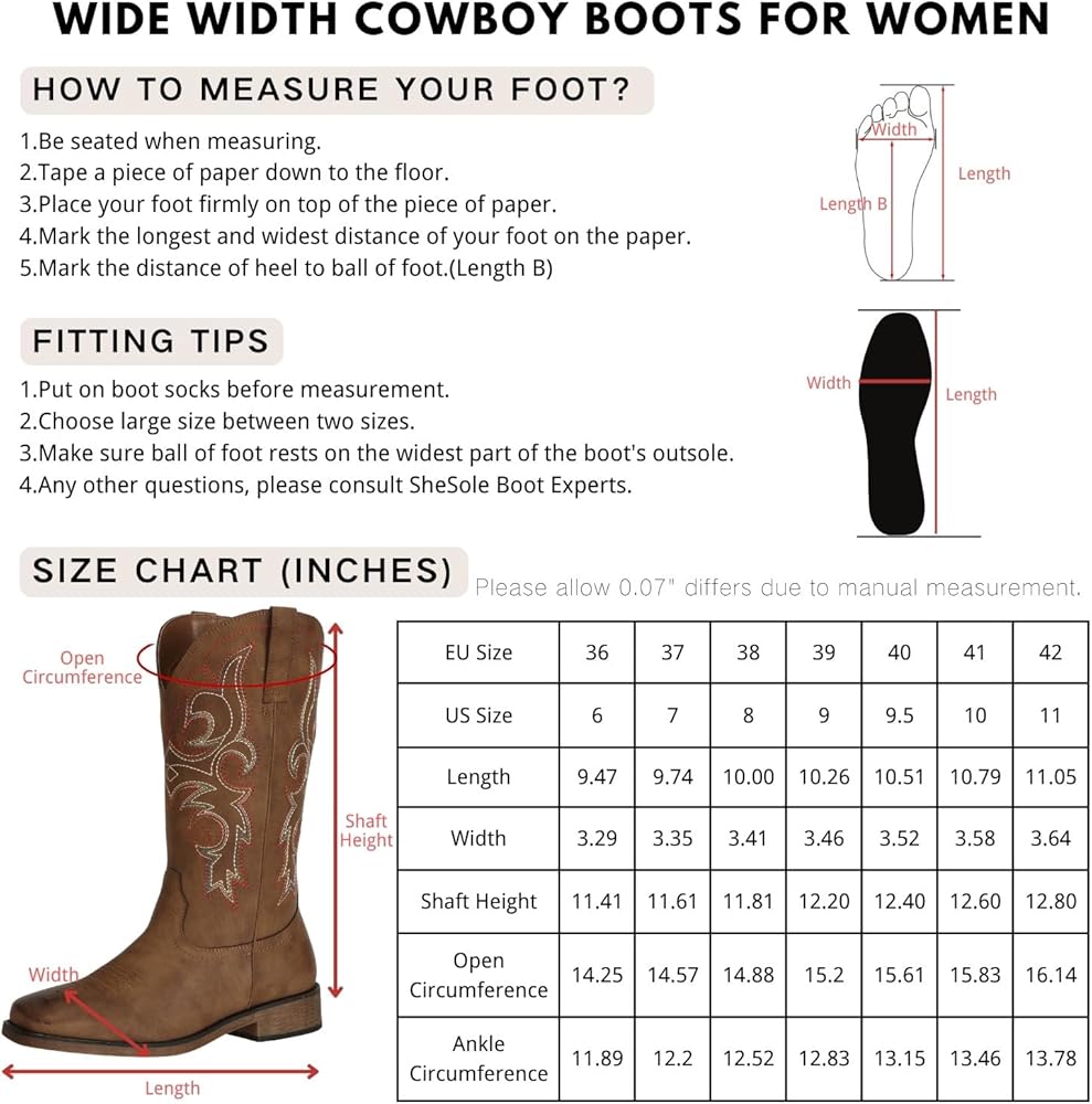 TRUE WIDE WIDTH: The women's cowboy boots are designed for wide foot. Our unique fit gives you extra wide width and extra room around your whole foot, your feet and calf can splay out and relax.