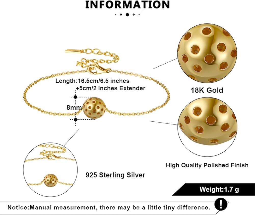 🔶【Product Features】PickleBelle gold chain bracelet measures 6.5 inches with 2-inch extender, featuring 8mm Gold ball. A sophisticated blend of elegance, expressing the wearer's love for pickleball.