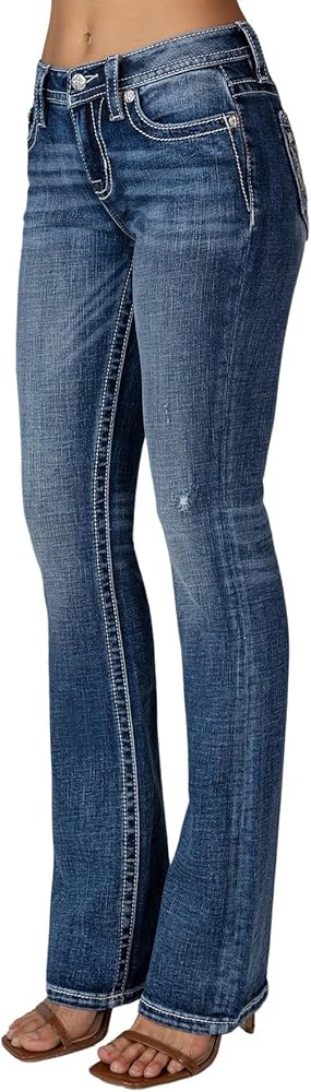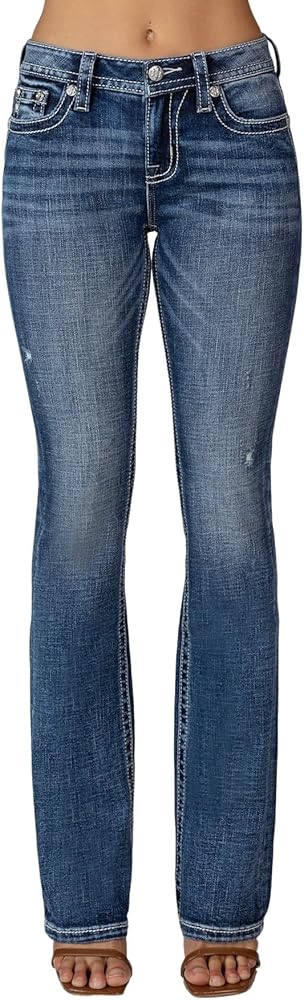 Miss Me women's mid-rise slim boot jeans in a classic slim-fit bootcut silhouette.