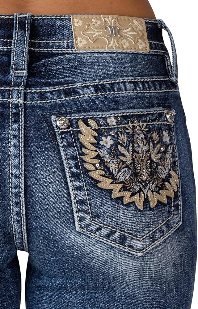 This pair of Miss Me slim boot jeans feature a mid-rise waist, subtle fading and whiskering, and back pockets embellished with a striking tan, cream, and gold emblem design.