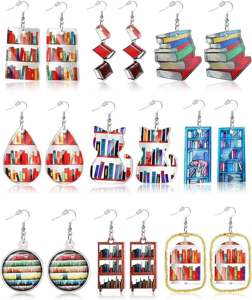 9 أزواج من أقراط الكتب للنساء أقراط مكتبة هوب من الأكريليك المرح للقطط خزانة الكتب بيان عاشق الكتاب أقراط متدلية للمعلمين نادي الكتب والقطط والأم أو هدية العودة إلى المدرسة