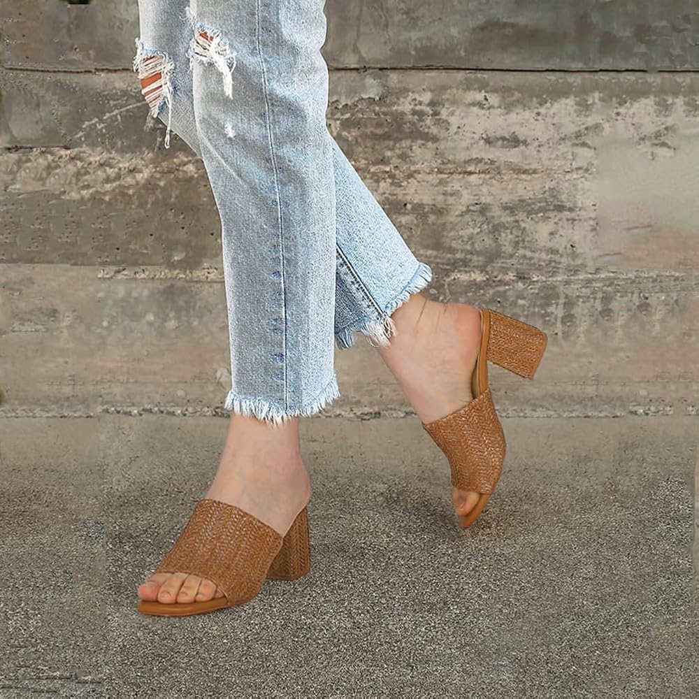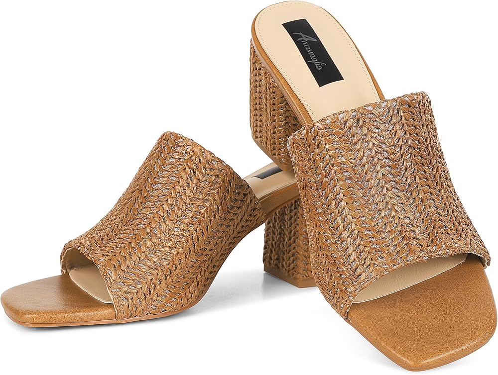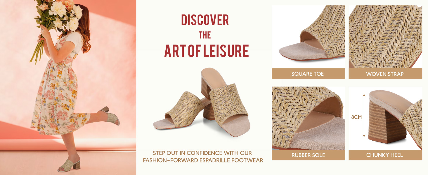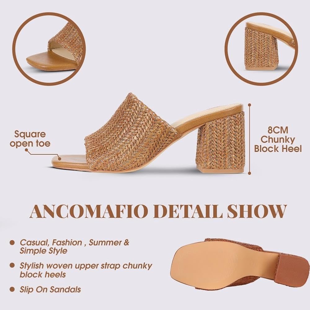 - أحذية بكعب عالٍ: تصميم مربع مفتوح عند الأصابع، وحزام علوي منسوج أنيق وكعب ثابت يجعل هذه الصنادل عصرية ومريحة.