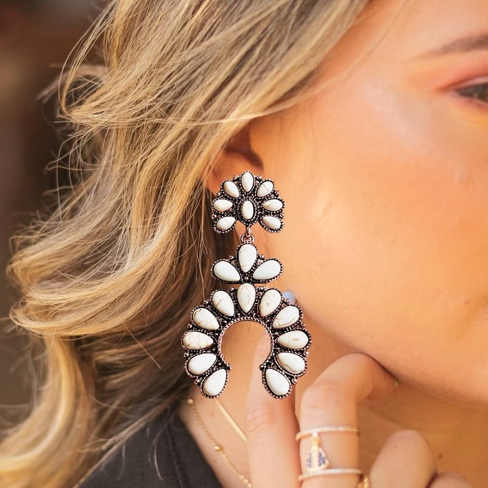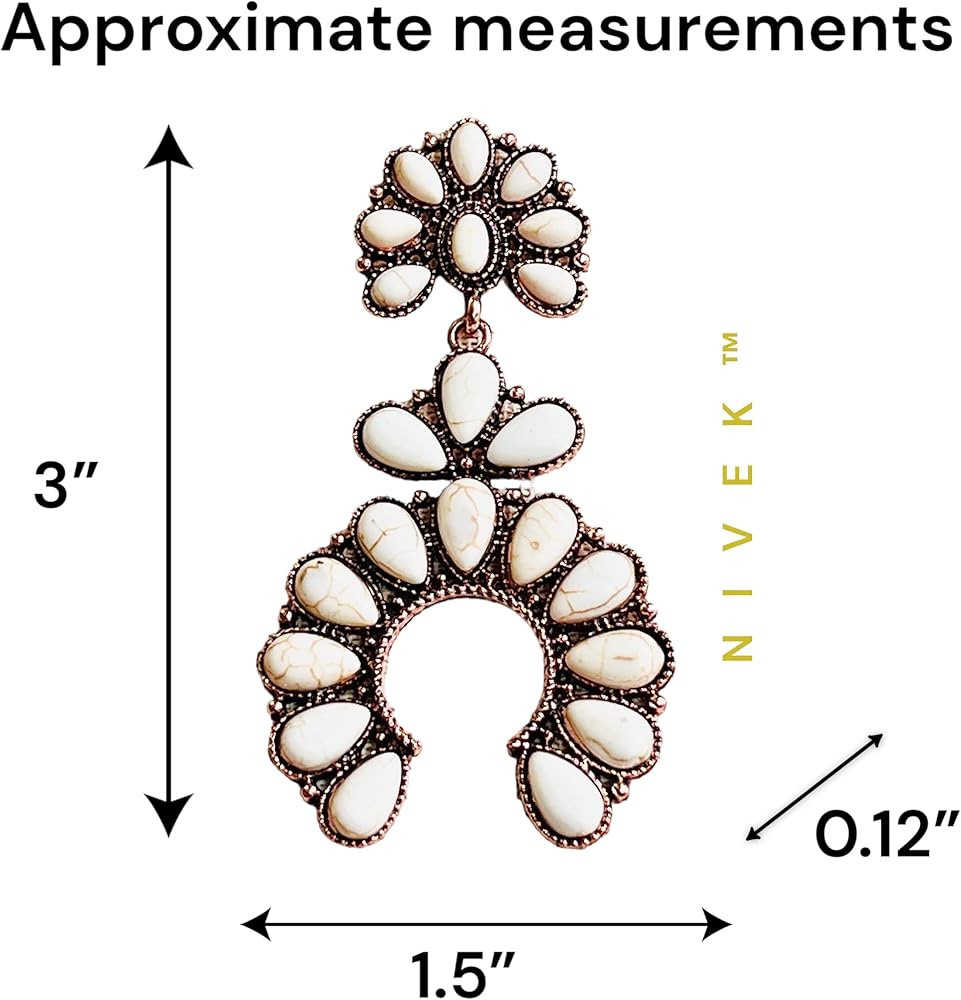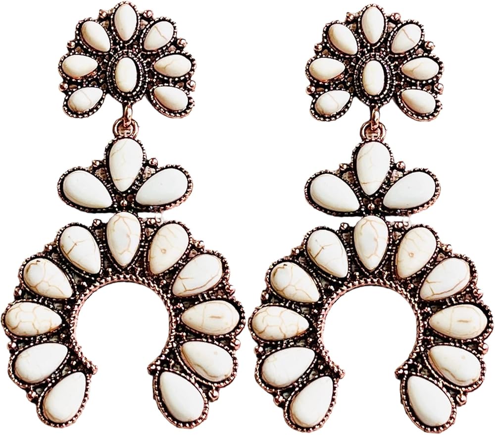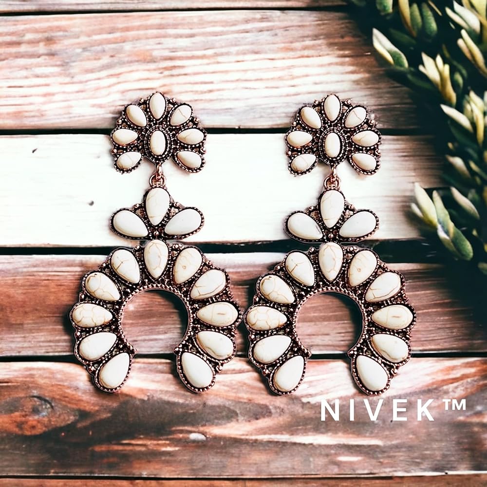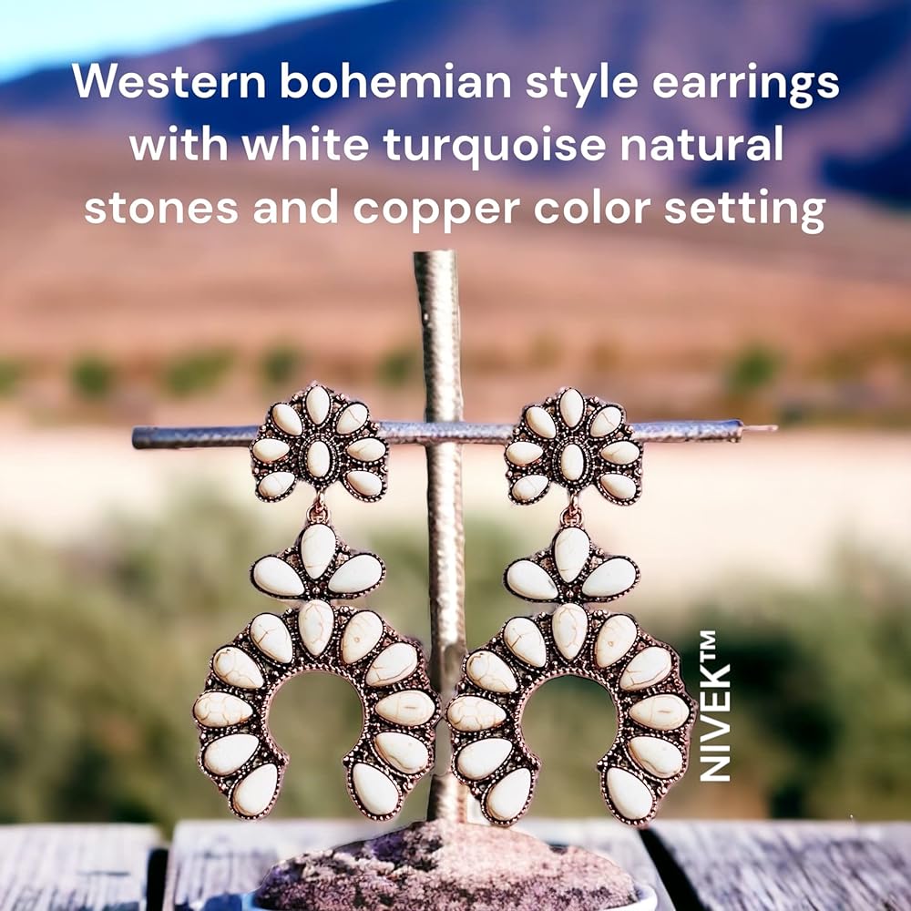 حلق كبير على الطراز الغربي الابيض من نيفيا، اقراط متدلية على شكل زهرة الاسكواش على شكل حدوة حصان متدلية بوهيميان بلون نحاسي اصلي بطول 3 انش، حجر طبيعي، حجر, حجر طبيعي, حجر