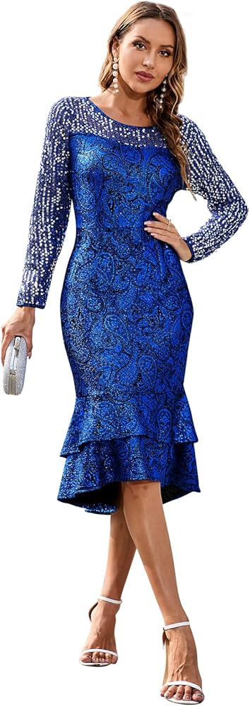Cololura Women's Elegant Long Sleeve Crew-Neck Evening Prom Gown Sexy Midi Dresses Patchwork Sequin Sparkly Formal Dress