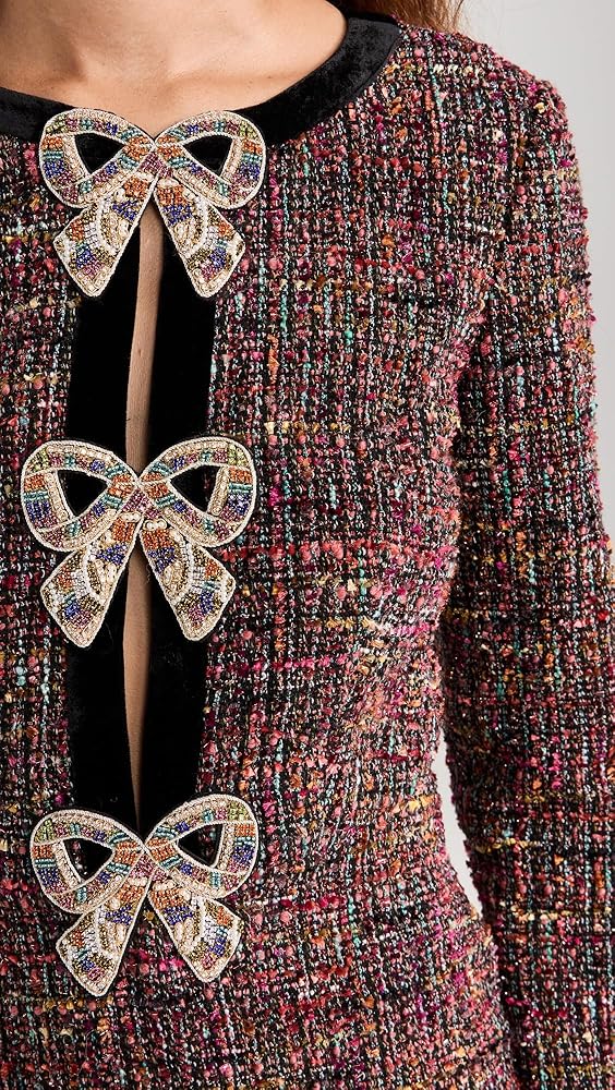 • خط عنق دائري وأكمام طويلة، فتحات من الأمام مع زينة على شكل فيونكة مطرزة، زخارف من الترتر بألوان قوس قزح بالكامل، زخرفة مخملية