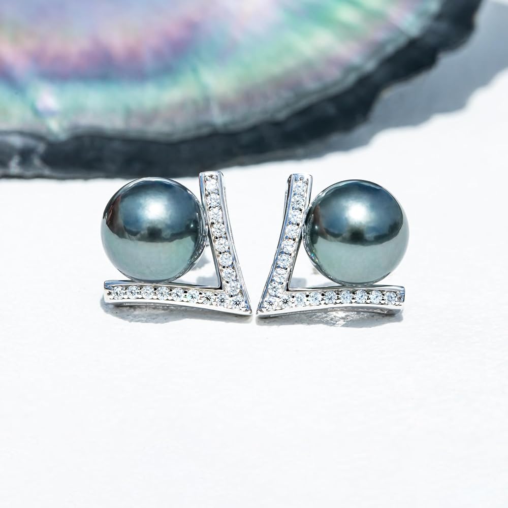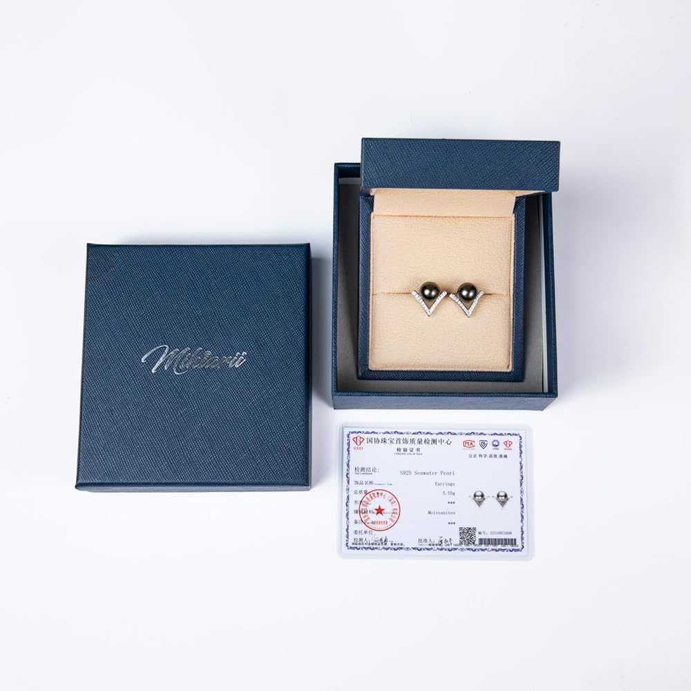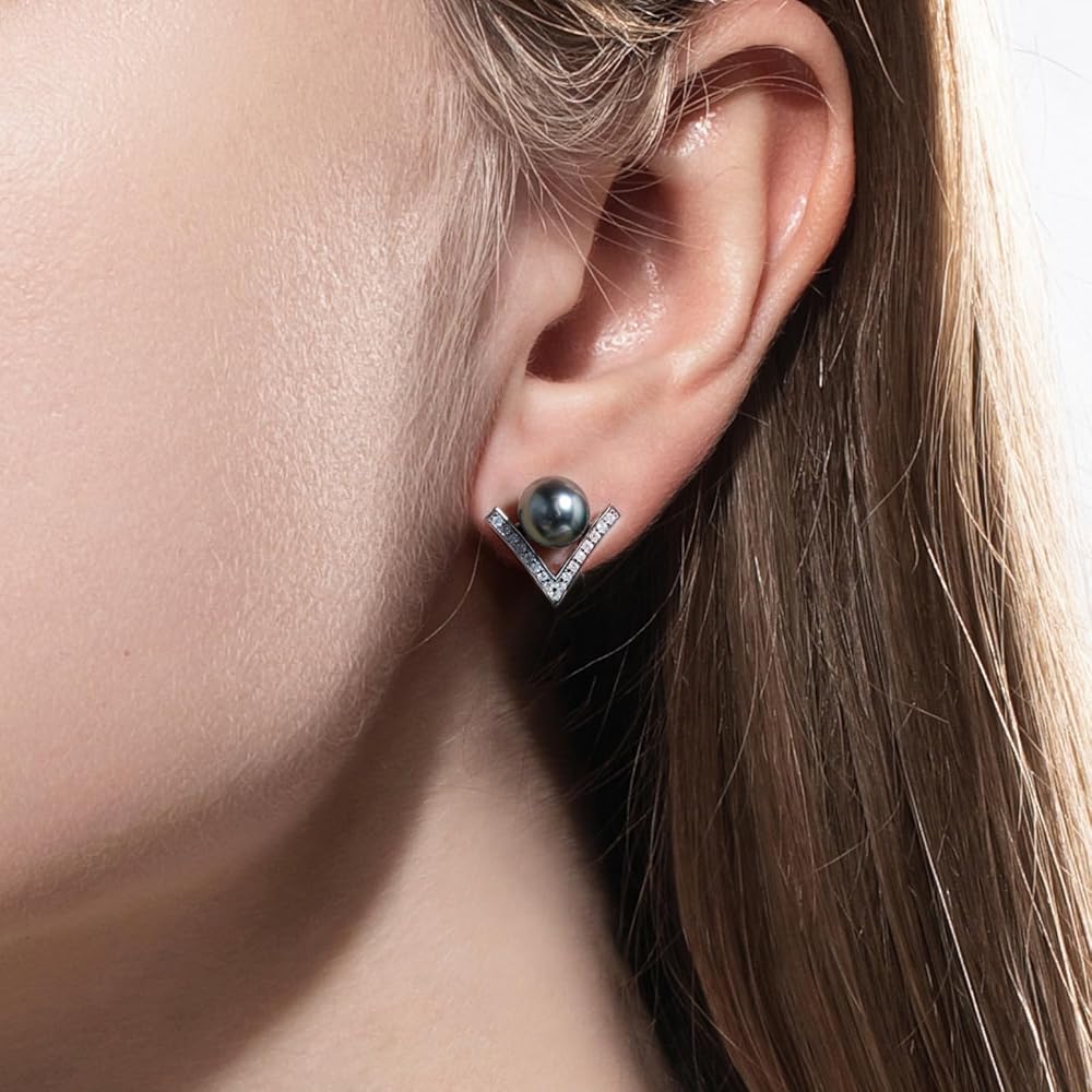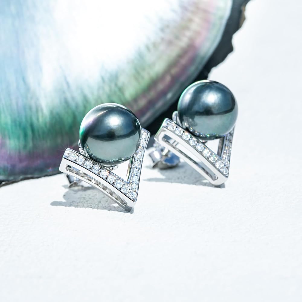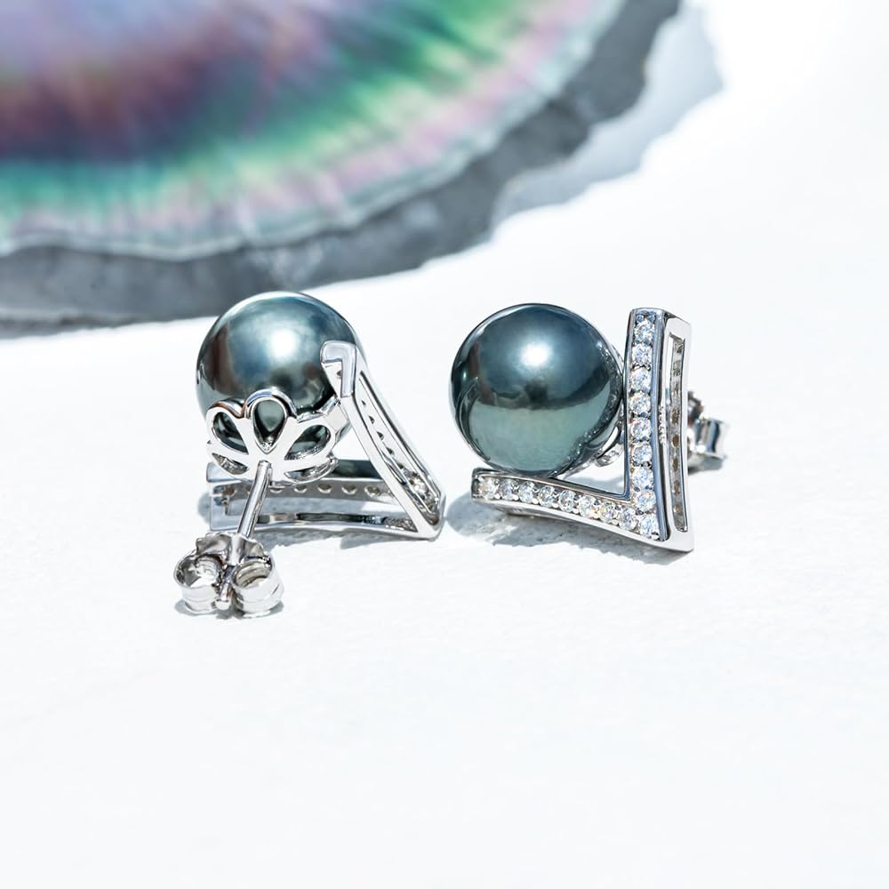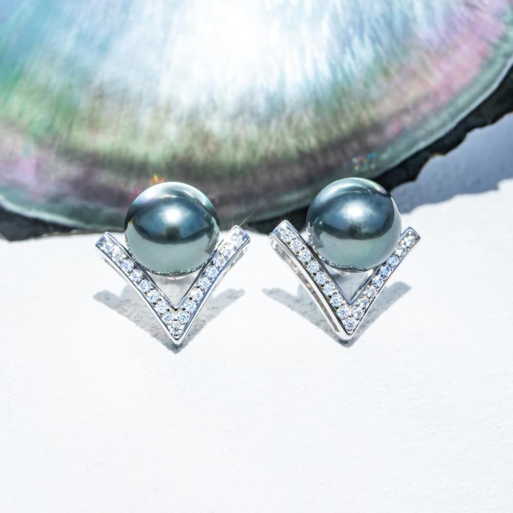 أقراط من اللؤلؤ التاهيتي الأسود مقاس 9-10 مم، لآلئ سوداء طبيعية مختارة يدويًا من AAA، تصميم كلاسيكي على شكل حرف V، خاتم من الفضة الإسترليني مطلي بالذهب الأبيض عيار 18 قيراط مع مويسانيتي D اللون، هدايا للنساء