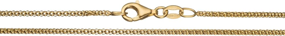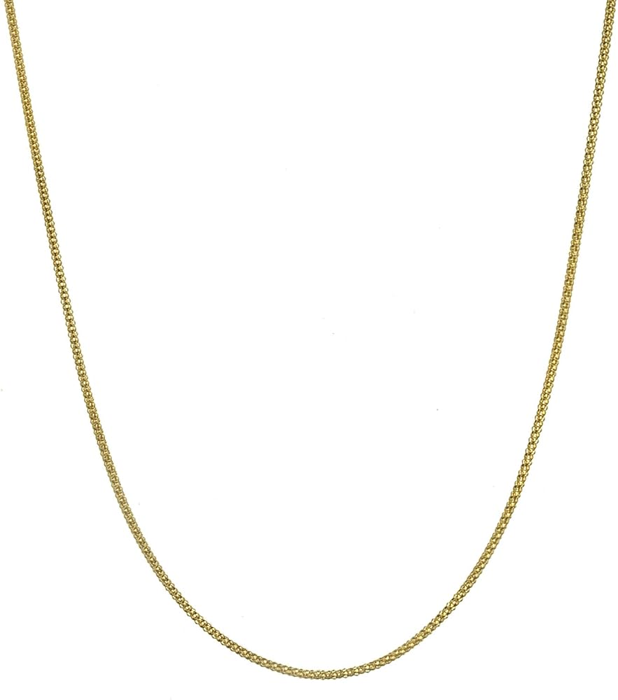 This beautiful, high quality 1.6mm thin popcorn chain necklace is very durable, yet lightweight and comfortable to wear. It is made in Italy with the finest craftsmanship, using only solid .925 genuine sterling silver with a shimmering 18K yellow gold flashed color. Each chain is stamped 925 and ITALY for authenticity. Our chains are imported directly from the Italian manufacturer, allowing us to offer you the lowest prices. This chain is secured with a heavy duty lobster claw clasp, which is more durable than the standard spring ring clasp used in other chains. Available in a wide variety of sizes from 14" - 36". Select your desired length from the drop down list.