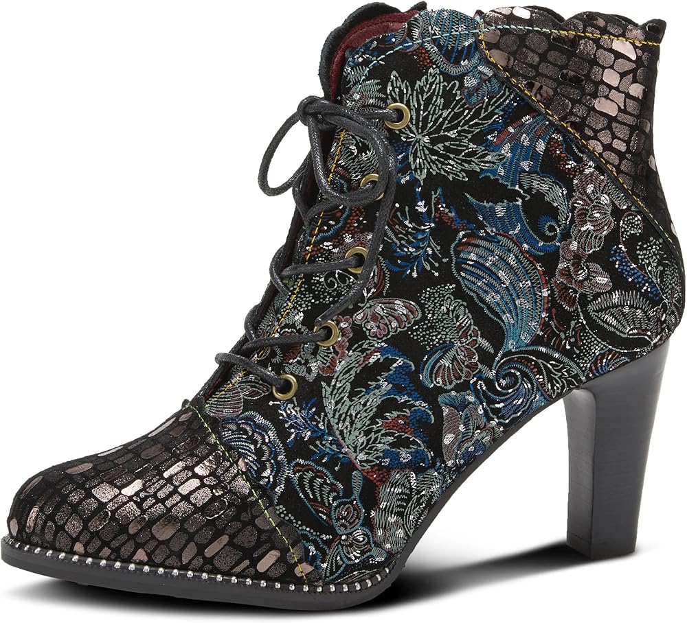 L'Artiste Style: Glitterail French-inspired metallic patterned leather boot with beautiful floral printed microfiber, vibrant rainbow stitching detail and 5 antique eyelets with a wax cotton lace. Heel Height (approximately): 3 ¼” Platform Height (approximately): 1/4" Shaft Height (approximately): 4" Circumference (approximately): 10" Features: -Almond toe, premium metallic leather, beautiful floral printed microfiber. -Full length inside zipper closure with brushed metal zipper pull. -Soft and cozy monochromatic paisley textile lining. -Synthetic leather padded insole. -Architectural elegant heel design -Rubber outsole. -Imported. Disclaimer: L'Artiste products are made with natural tanned leather using traditional hand painting techniques. This unique finishing process is used to create a natural effect with color variations to deliver authentic look and beauty.