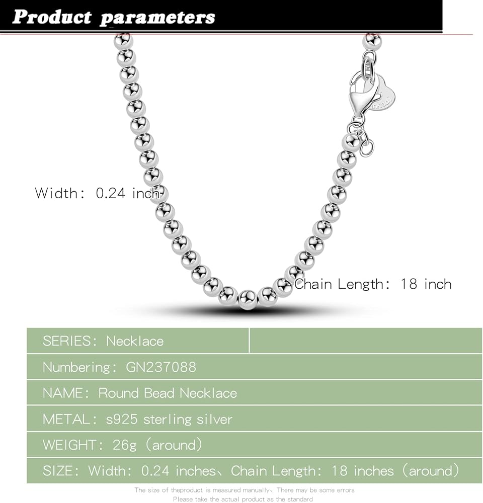 MODERN CLASSIC - Add style to a basic look with this solid 100% 925 sterling silver 6mm Beads Link Chain. The circular beaded design is simple and fashion,perfect shine. It is strong and durable for daily wear yet not too thick for a comfortable fit. Wear alone with casual or formal attire for everyday modern elegance, with your favorite pendant for a personal statement or as a great layering chain. It's the perfect necklace for everyday wear