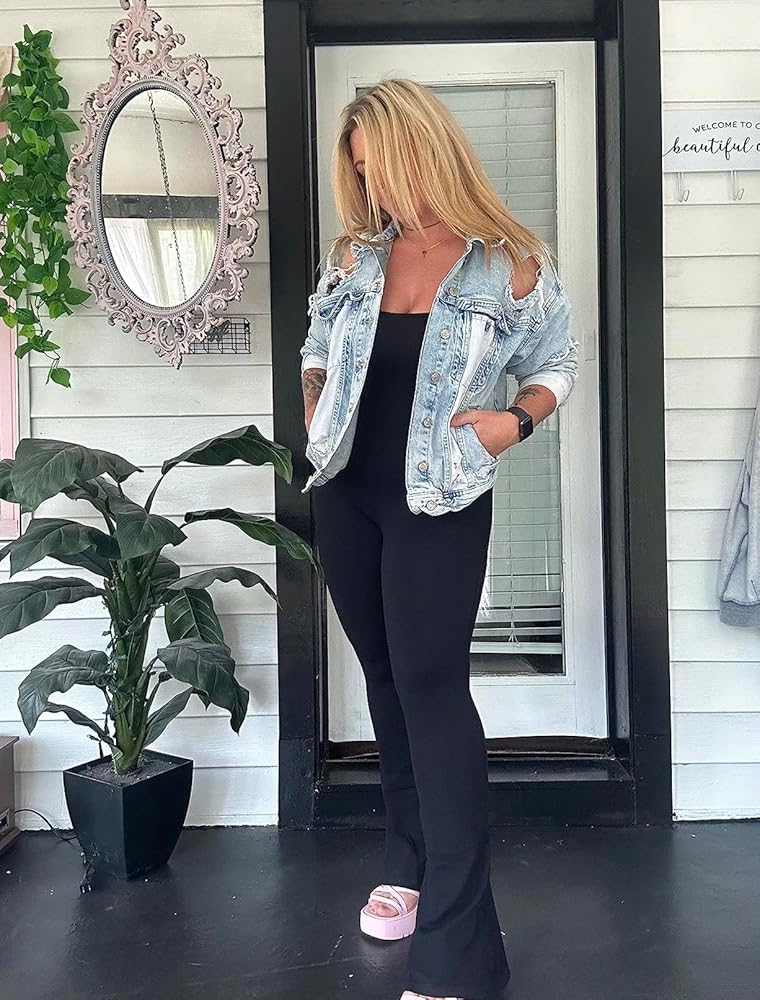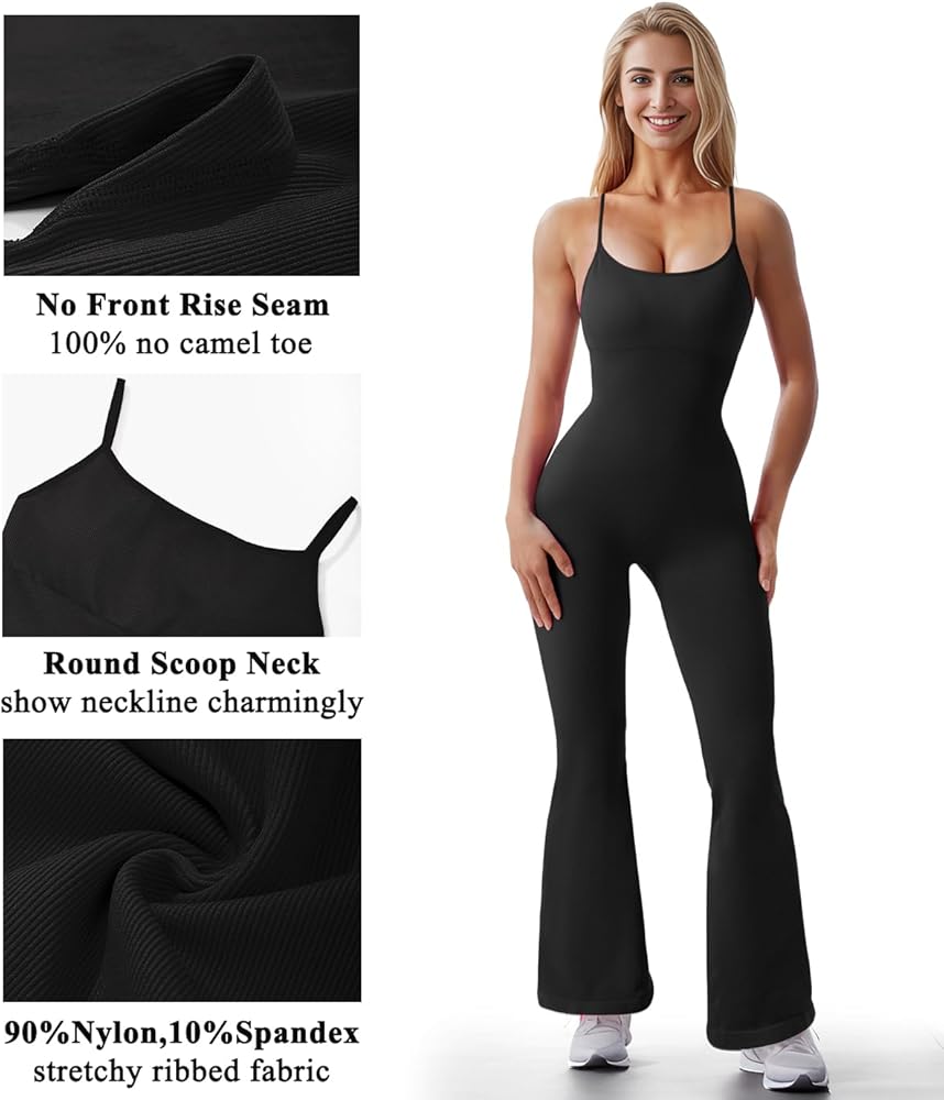 • 【بدلة متوهجة بدون درزات أمامية】بذلة ذات ساق واسعة للنساء مع حمالة صدر مدمجة، وسادات قابلة للإزالة، وأشرطة قابلة للتعديل، رومبر لطيف برقبة واسعة، بذلة ضيقة مثيرة منخفضة الظهر للنساء الأنيقات.
