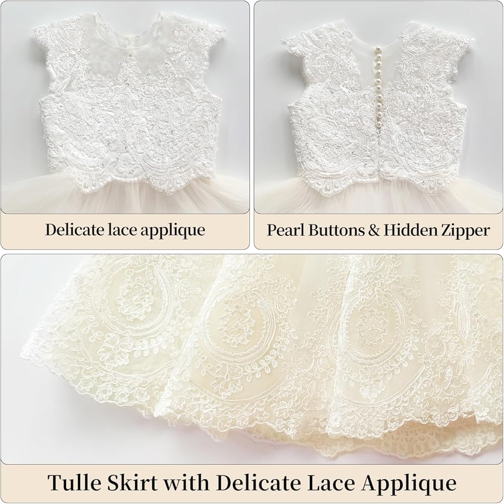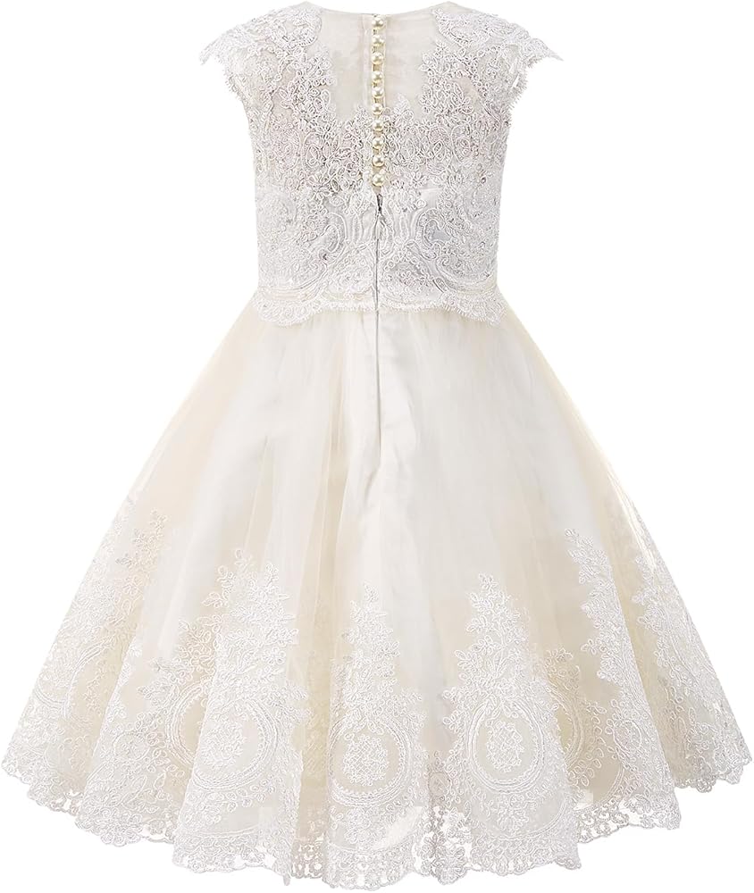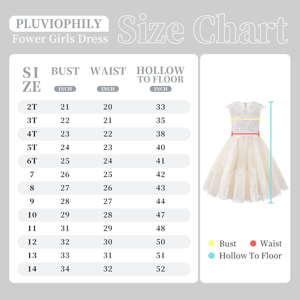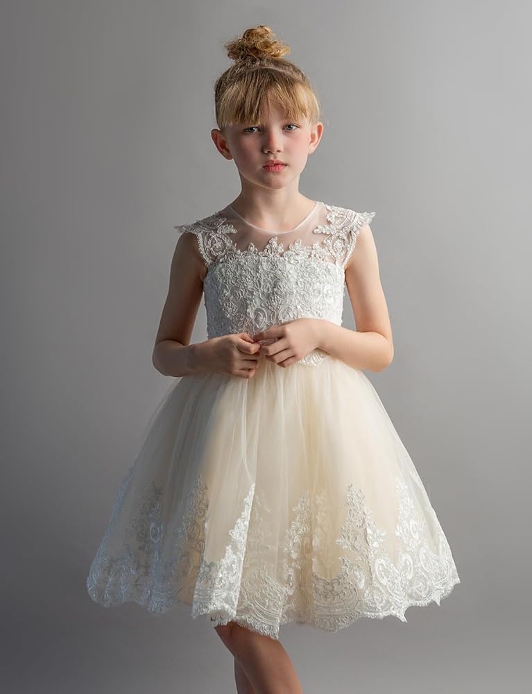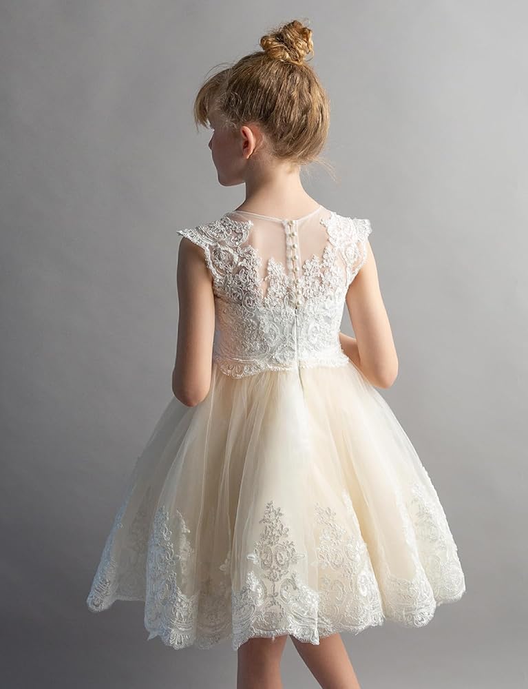 【ميزات فستان فتاة الزهور】أزرار لؤلؤية في الجزء العلوي من الظهر مع سحاب إغلاق مخفي؛ تنورة الأميرة تول الشمبانيا بطول الركبة.