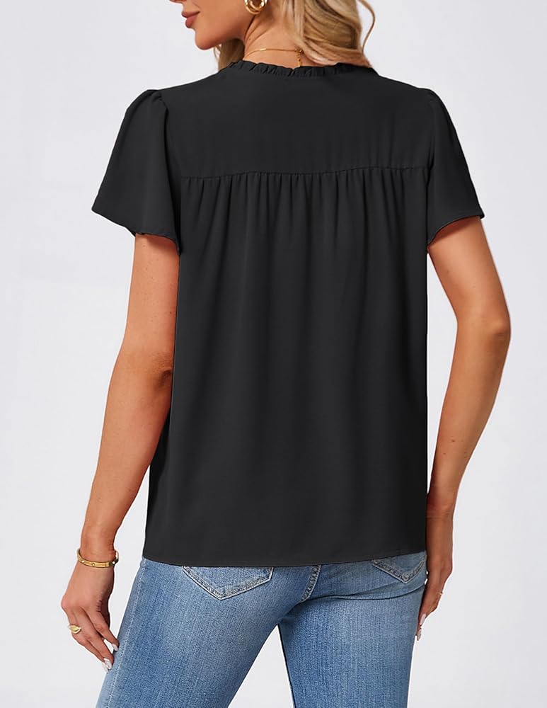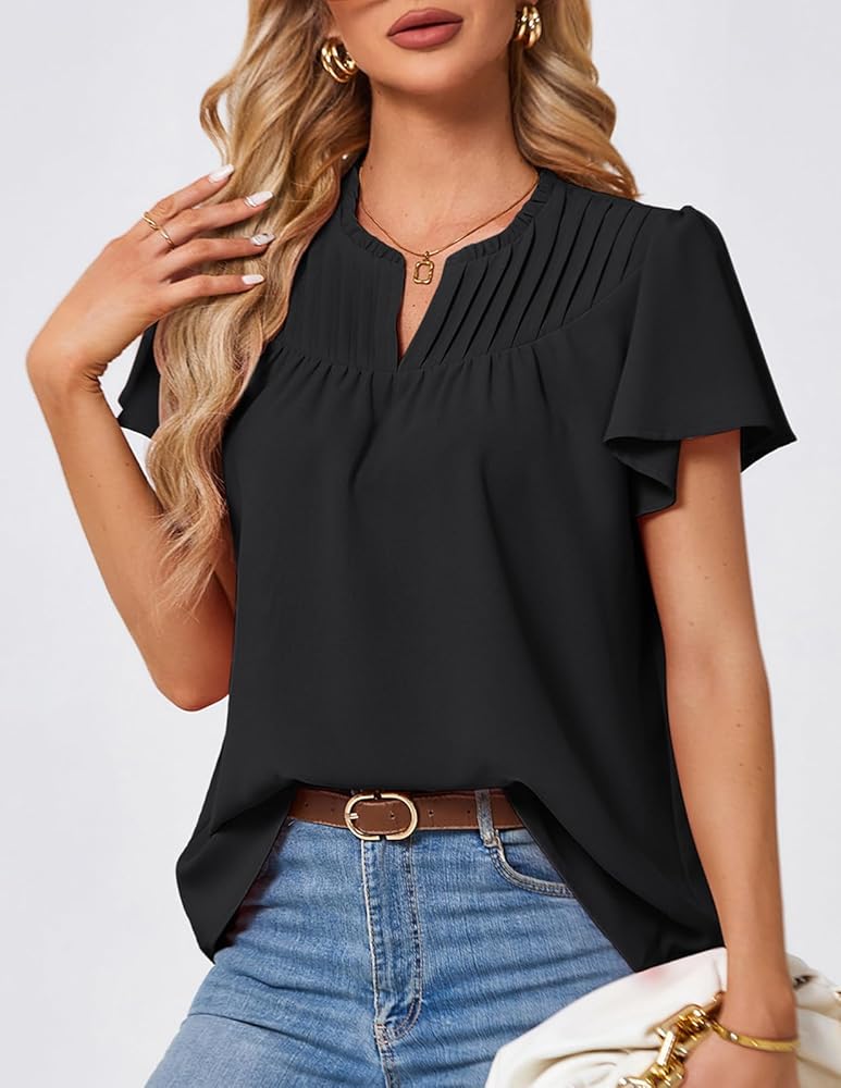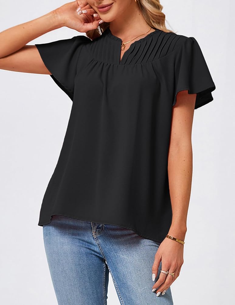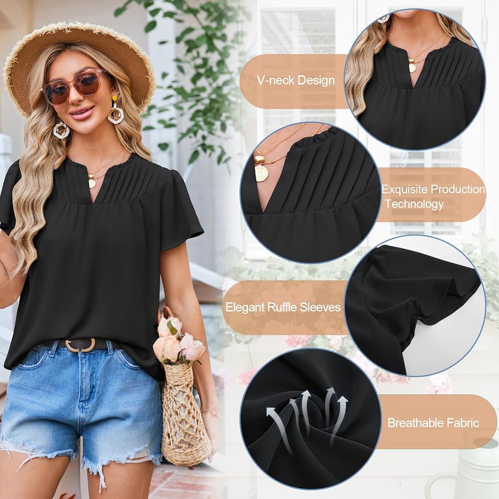• السمات - تتميز القمصان الأنيقة للسيدات برقبة على شكل حرف V مع زخرفة من الدانتيل الغارجي، ومطويات أمامية، وأكمام قصيرة واسعة، ولون ثابت، وثنية انسيابية، ومقاس فضفاض، ونمط لطيف وأنيق، مما يمنحك مظهرًا أنيقًا وعصريًا عند ارتدائه.