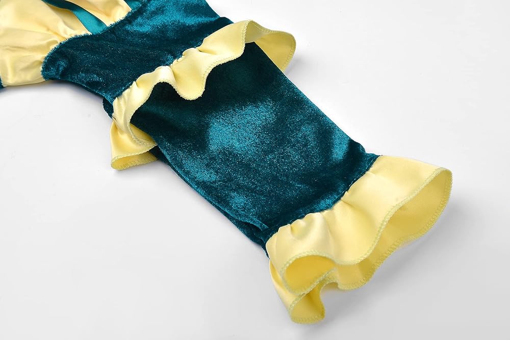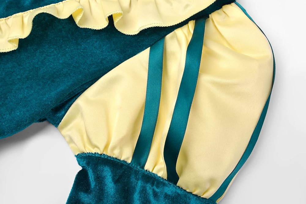 • الميزة: تم تنفيذ بعض ابتكارات التصميم على أساس الشخصيات الأصلية. الكشكشة على الأكمام وخط العنق والأقواس تضفي الحيوية والجمال؛ الأخضر الخاص والفريد والأصفر مشرق وناعم، مما يضيف إحساسًا بأشعة الشمس المنتهية ولايته والوداعة تحت اللون الرئيسي البطولي والمنخفض