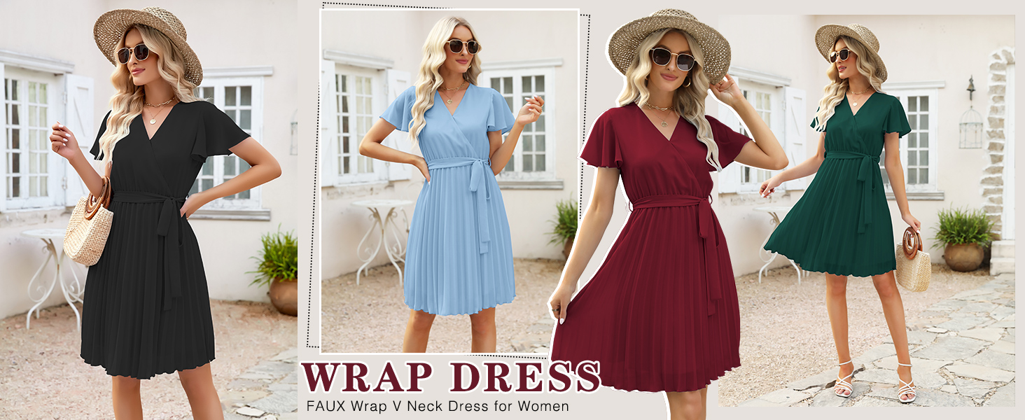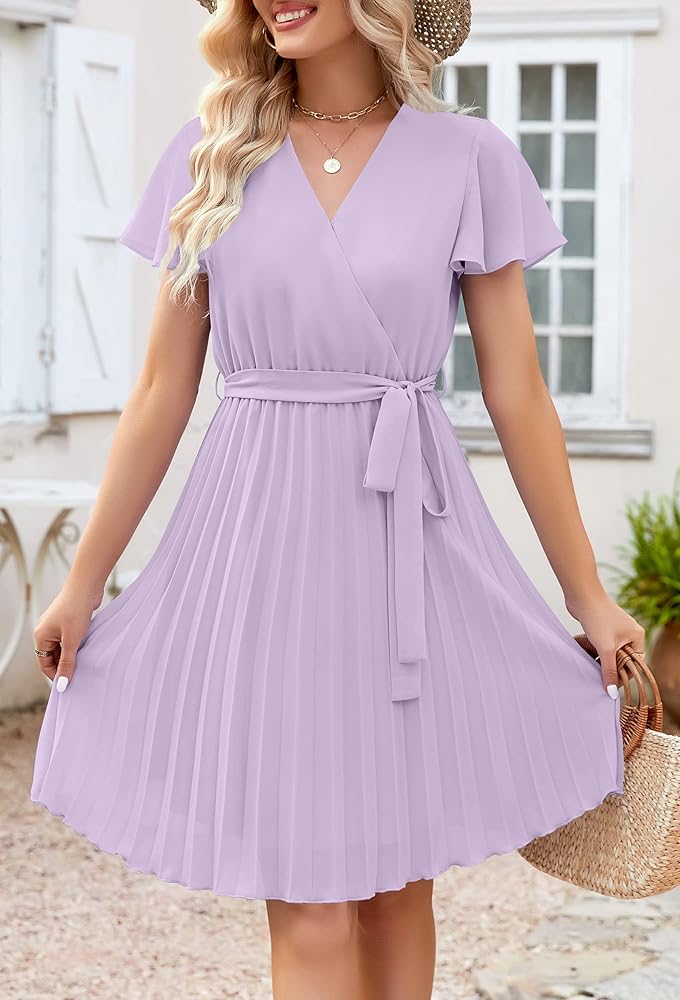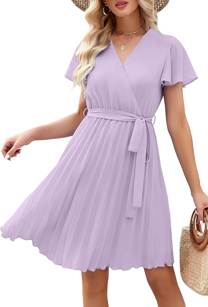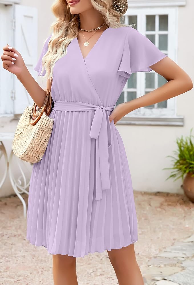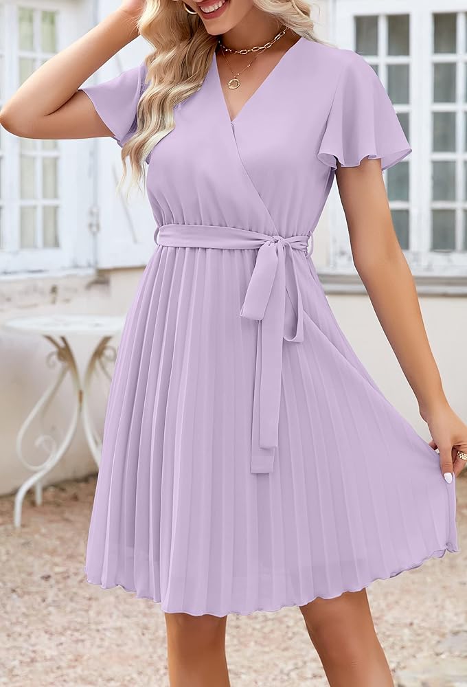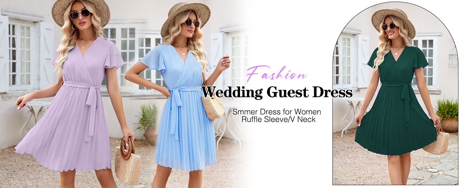 فستان OWIN للسيدات 2023 صيفي شيفون ملفوف على شكل حرف V لحفلات الزفاف وأكمام مكشكشة فساتين حفلات الكوكتيل غير رسمية بطيات