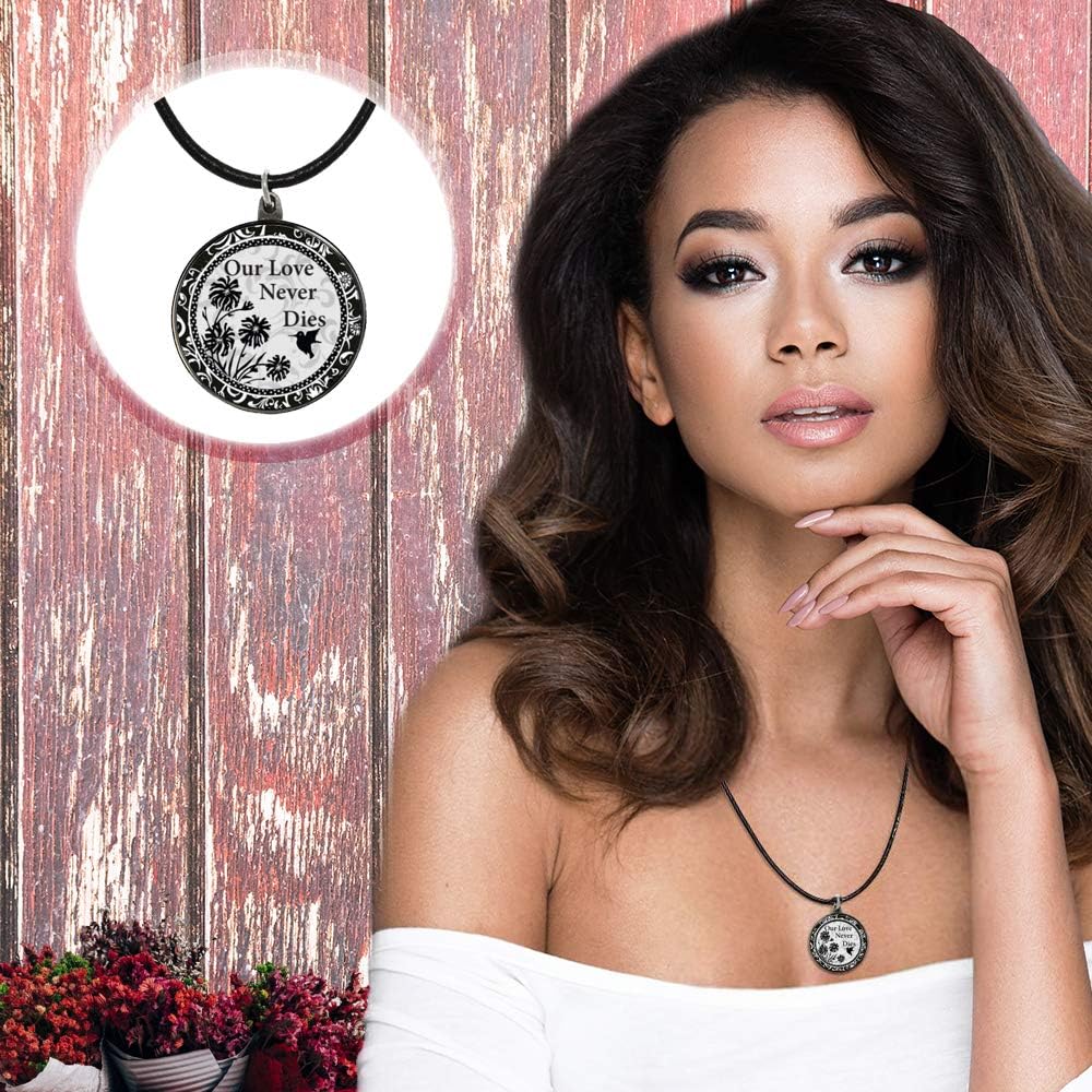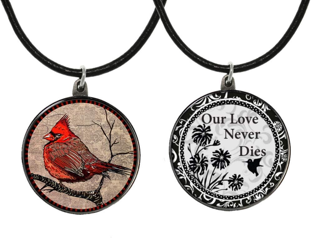 تتميز هذه القلادة الرائعة القابلة للعكس بتصميم فني من سبيريت على كلا الجانبين ومغلفة بالراتنج. يبلغ مقاس القلادة 7/8 بوصة عرضًا × 1-1/4 بوصة ارتفاعًا (من أعلى الثفل إلى أسفل التعليقة). على جانب واحد هو إبداعها الكارديالي الجميل وعلى الظهر مكتوب عليه "Love Never Dies". تأتي أيضًا مع سلسلة من الجلد النباتي الأسود مقاس 40.64 سم مع وصلة تمديد 5.08 سم.