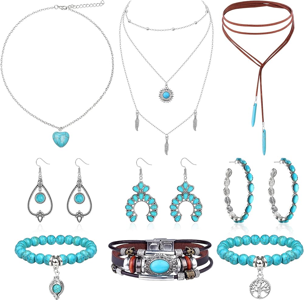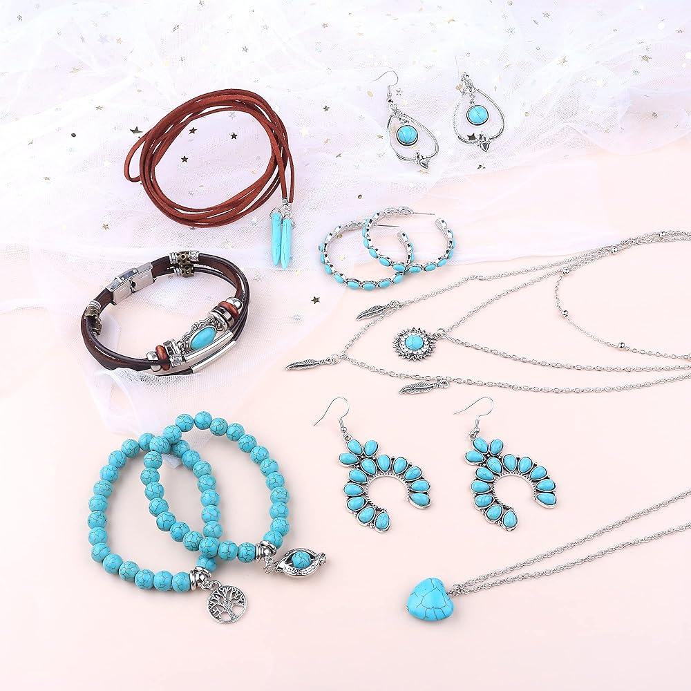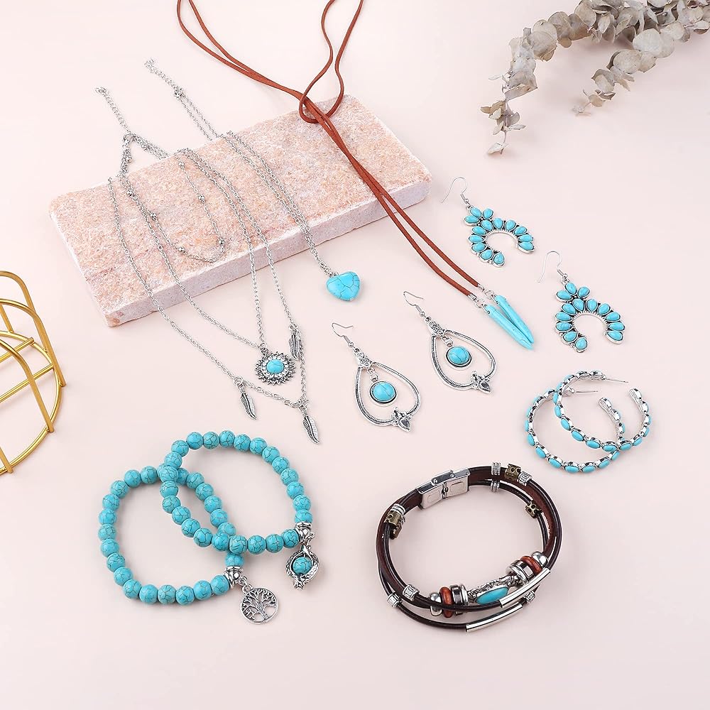 مجموعة مجوهرات فيروزية مكونة من 12 قطعة - تتضمن العبوة 12 قطعة من المجوهرات الغربية، تتضمن 3 قطع من القلادات الفيروزية (قطعتان من القلادة، قطعة واحدة من القلادة ذات الطبقات)، 6 قطع من الأقراط الفيروزية (زوج من الأقراط المتدلية، زوج من الأقراط الحلقية) و3 قطع من الأساور الفيروزية (قطعتان من الأساور ذات الخرز الفيروزي، قطعة واحدة من الأساور الجلدية ذات الطبقات). 3 مجموعات مختلفة من المجوهرات الغربية لا تلبي استخدامك اليومي واستبدالها فحسب، بل تتيح لك أيضًا مشاركتها مع عائلتك وأصدقائك