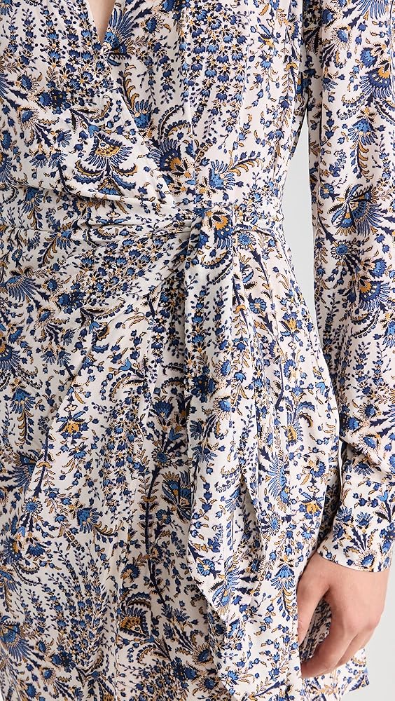 Collared V neckline hook-and-eye-closure at front, Long sleeves with button cuffs, Wrap silhouette with tie at waist, Floral print