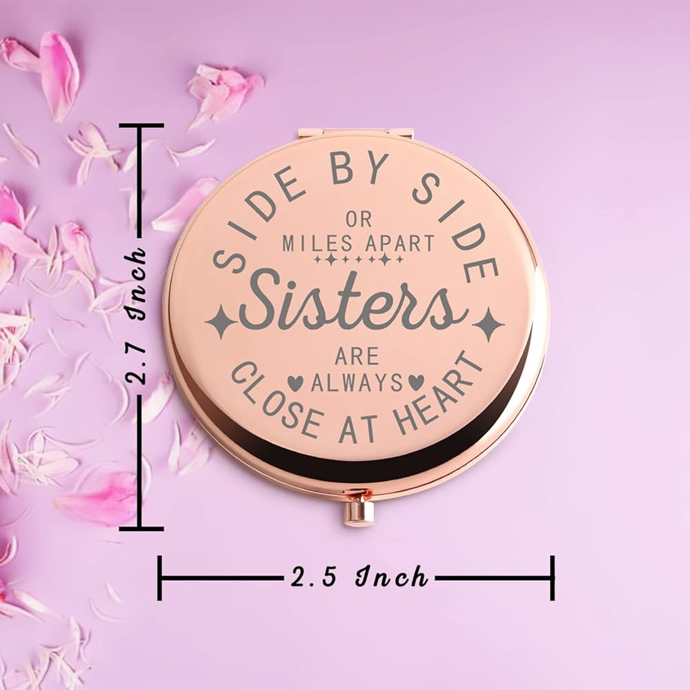 • 2.【Gift for Sister】:This mirror is printed with warm text "SIDE BY SIDE OR MILES APART OR MILES APART Sisters ARE ALWAYS CLOSE AT HEART"