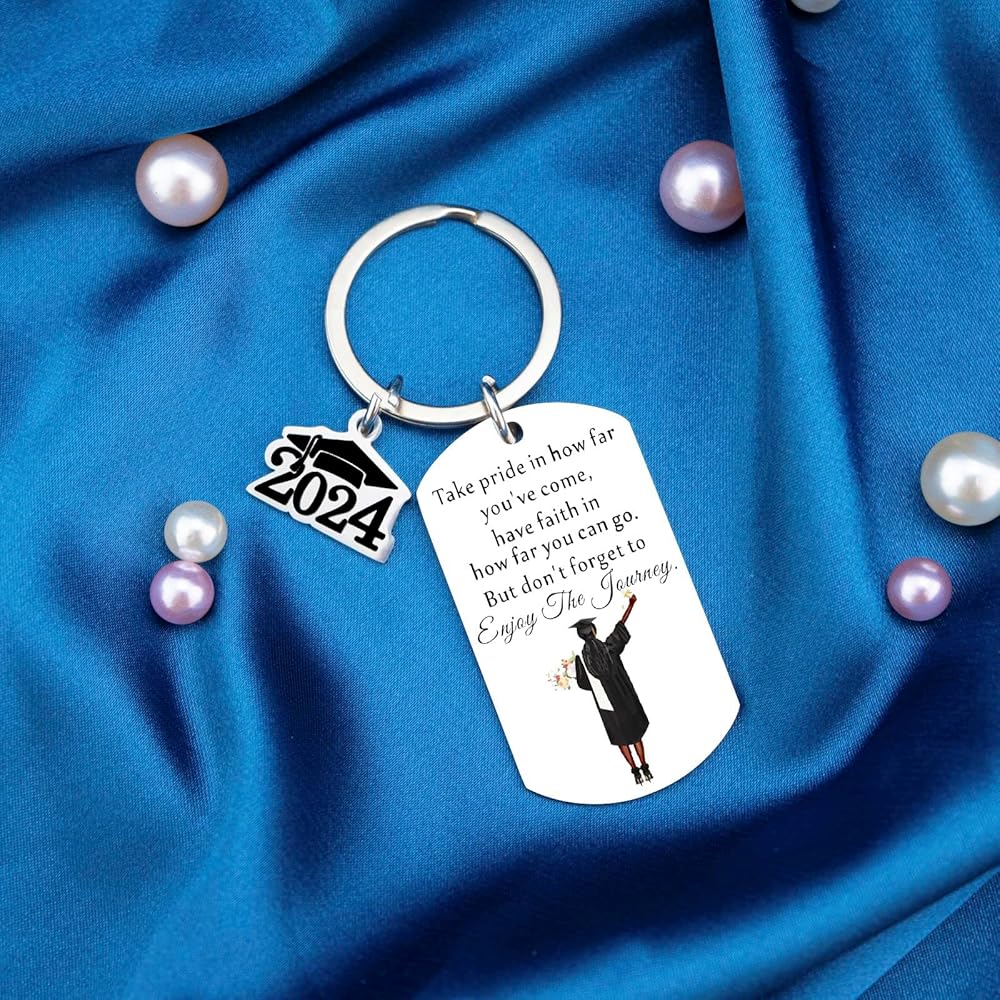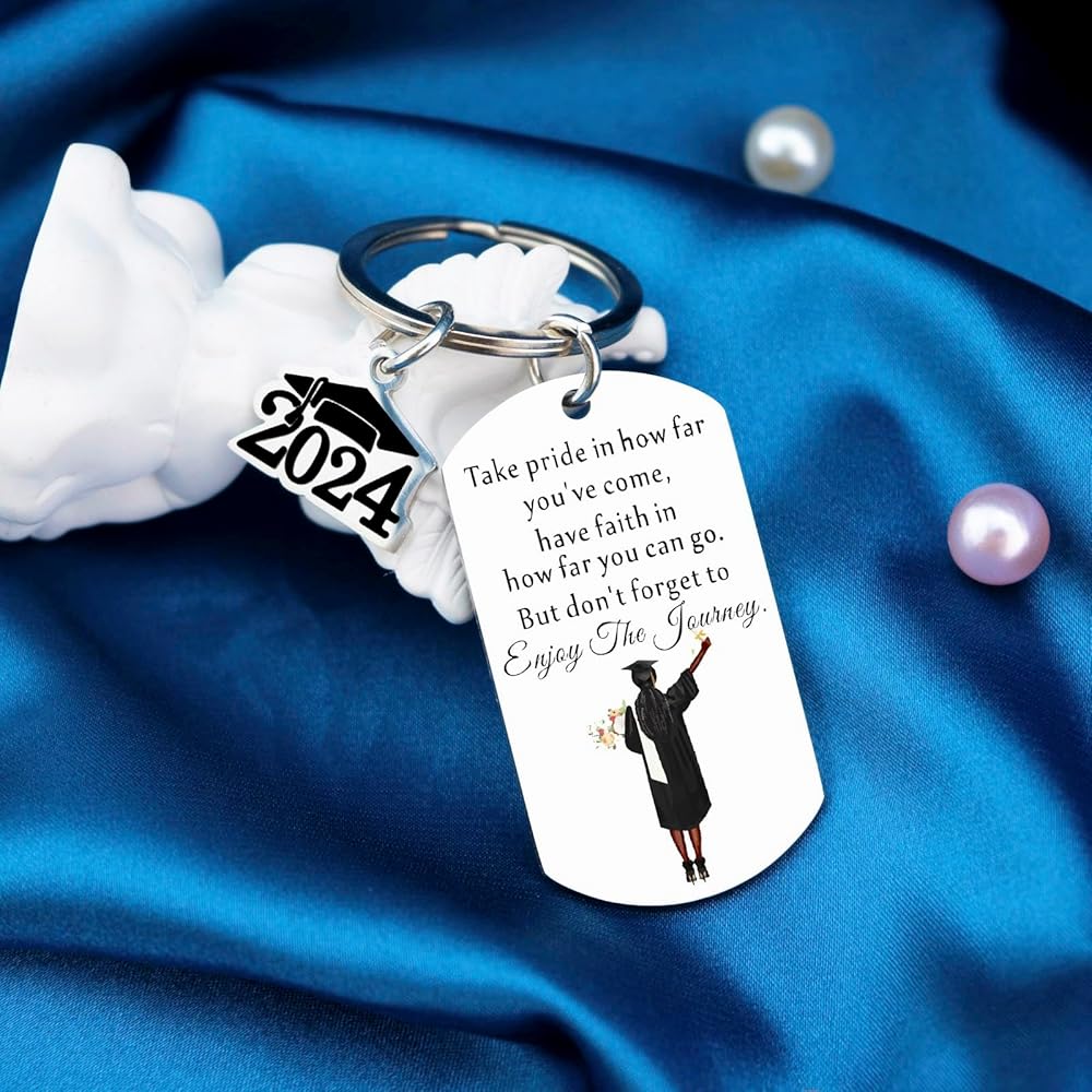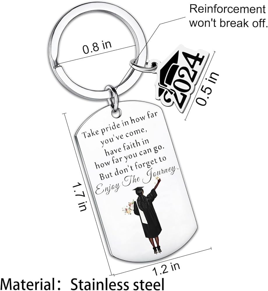 The graduation gift for her showcases an elegant silhouette of a female figure wearing a graduation gown, symbolizing the journey of education and personal growth. Adorned with a 2024 graduation cap pendant, it adds a touch of charm and commemoration to this meaningful keychain gift. It serves as a constant reminder for the graduates of their accomplishments and encourages them to embrace the future with confidence.