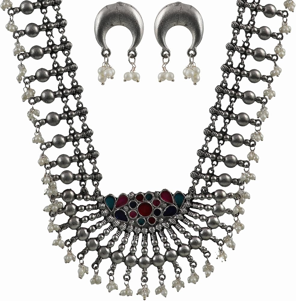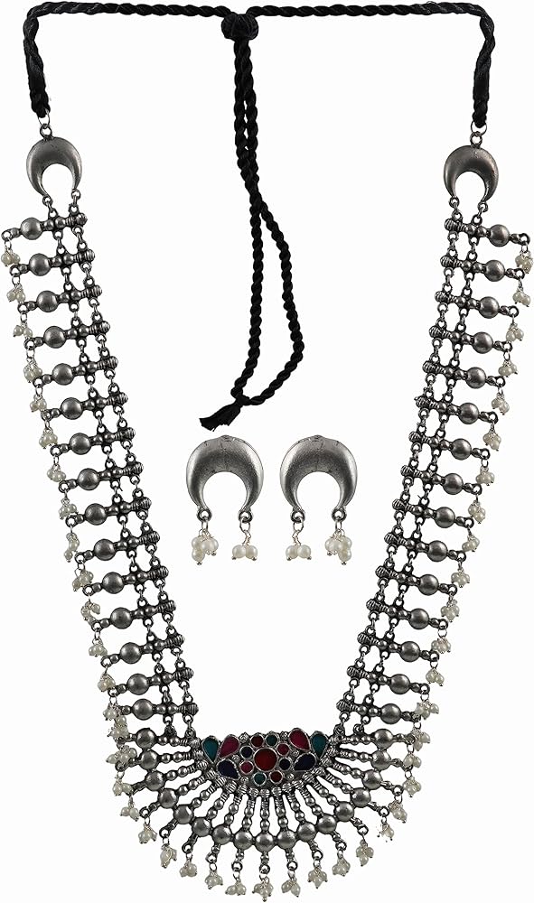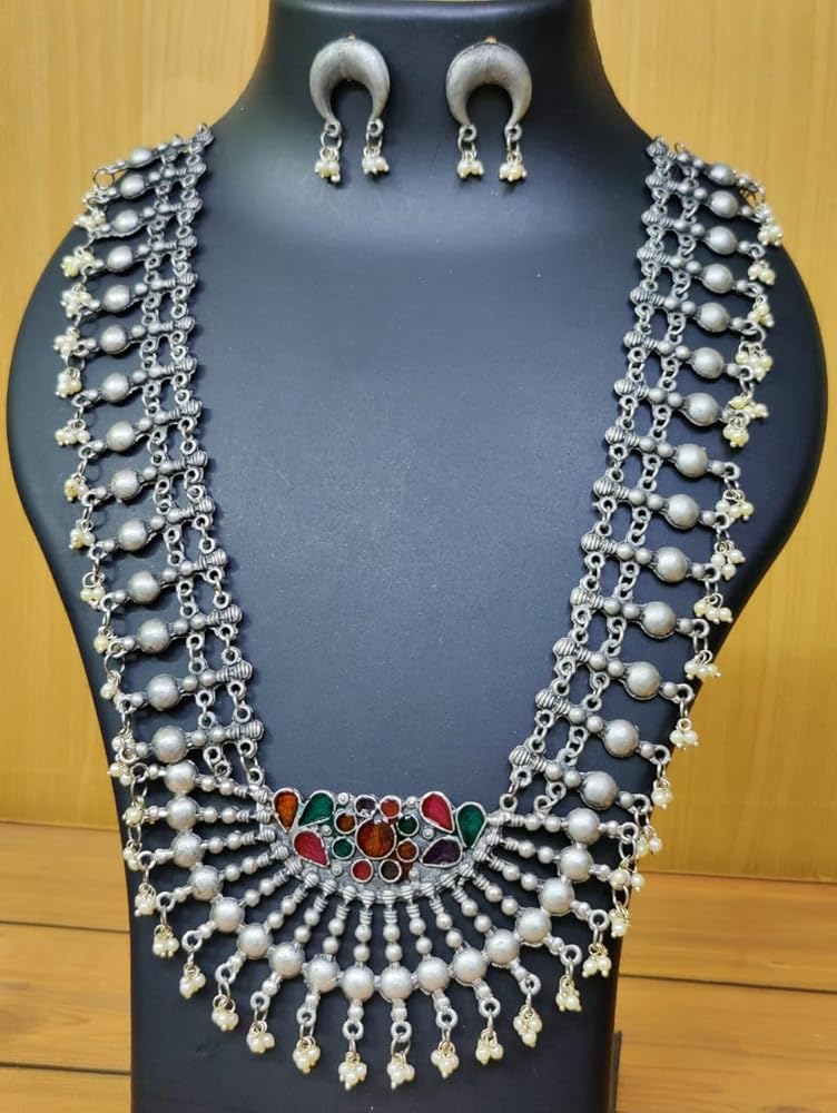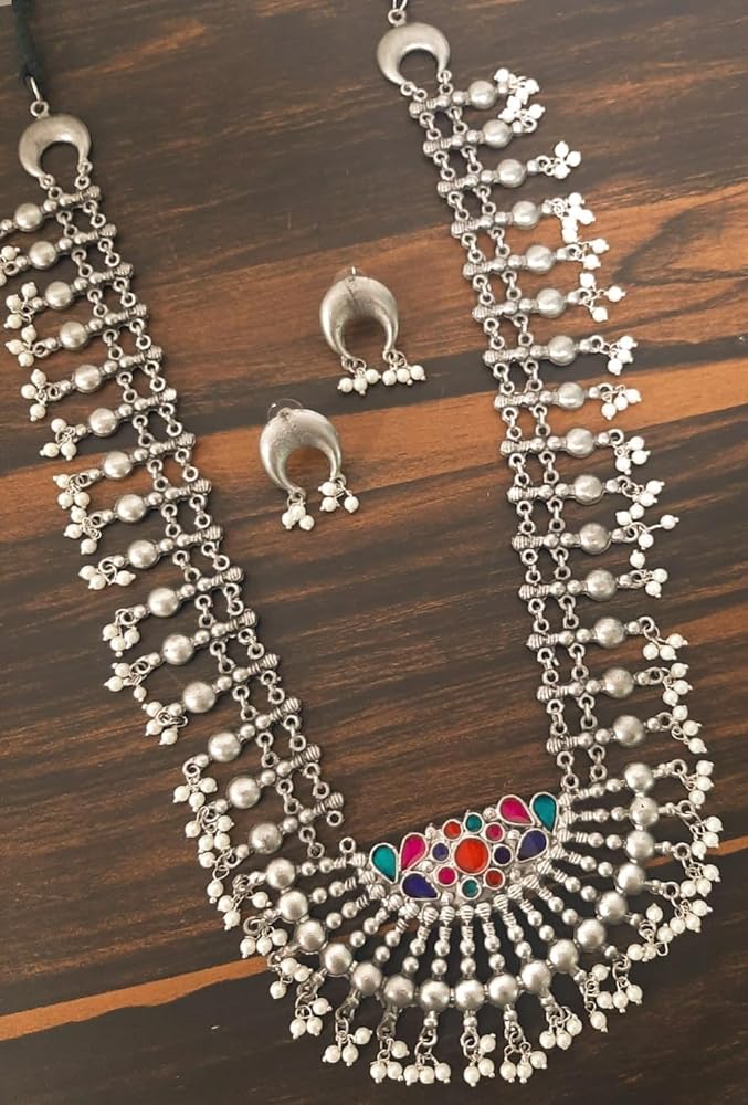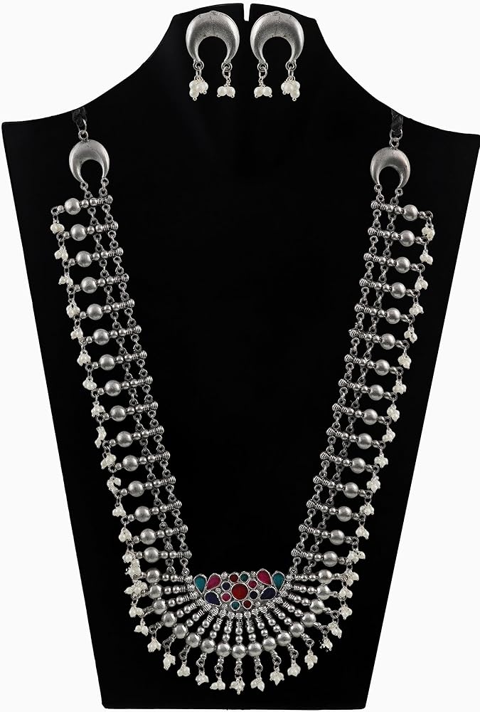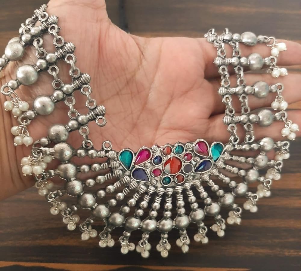 قلادة طويلة من الفضة الافغانية الهندية التقليدية بتصميم عرقي من سيدهاتفا، قلادة طويلة لوصيفة العروس للنساء والفتيات، 19 سم، معدن، بدون احجار كريمة, معدن, لا أحجار كريمة