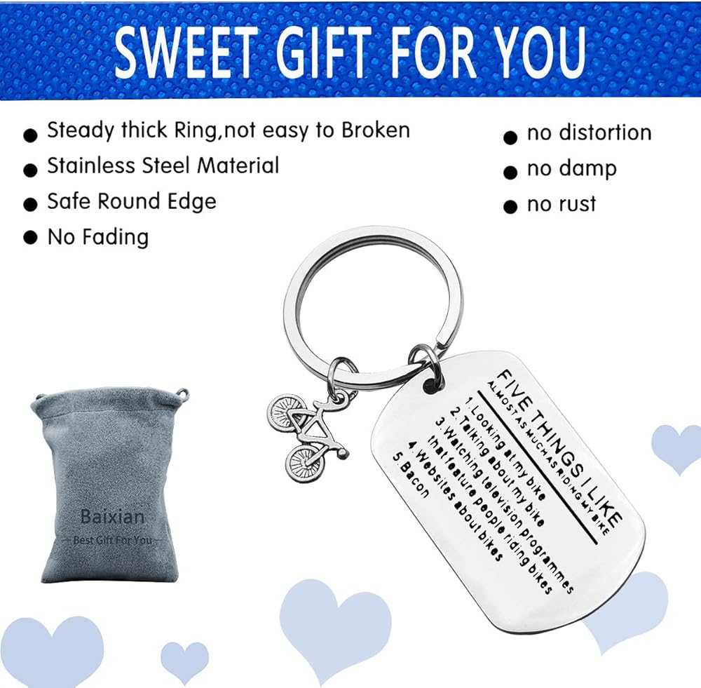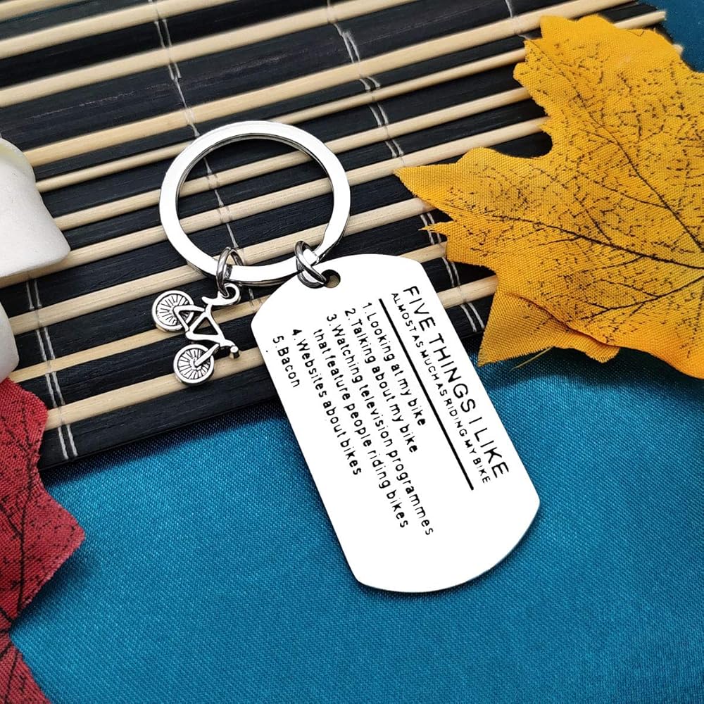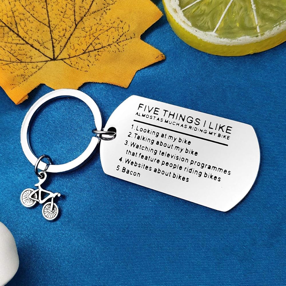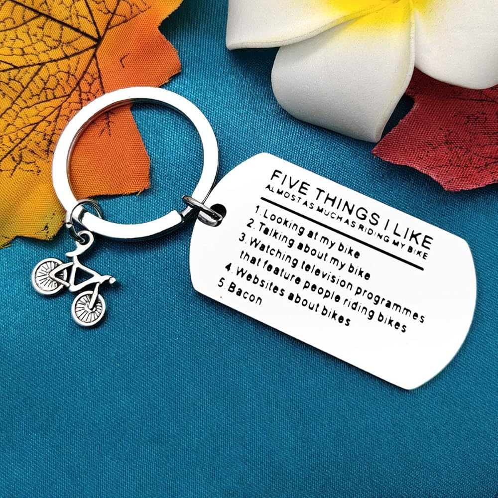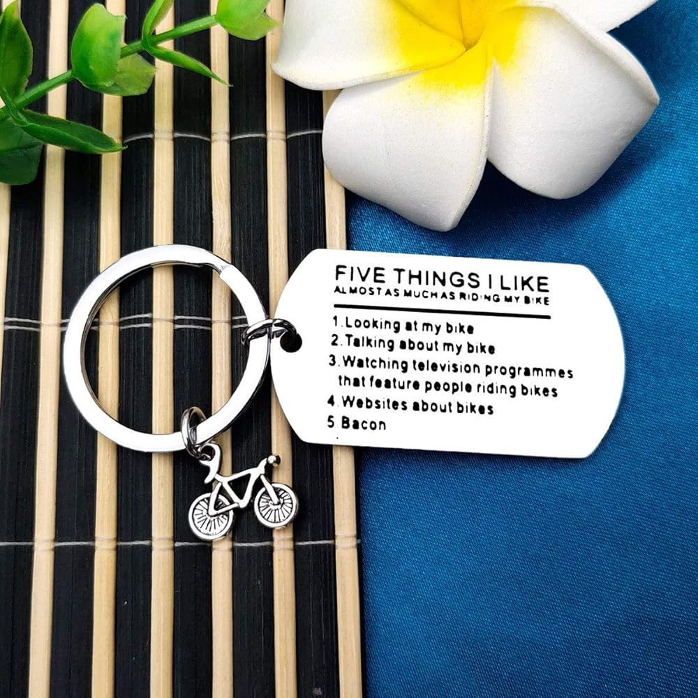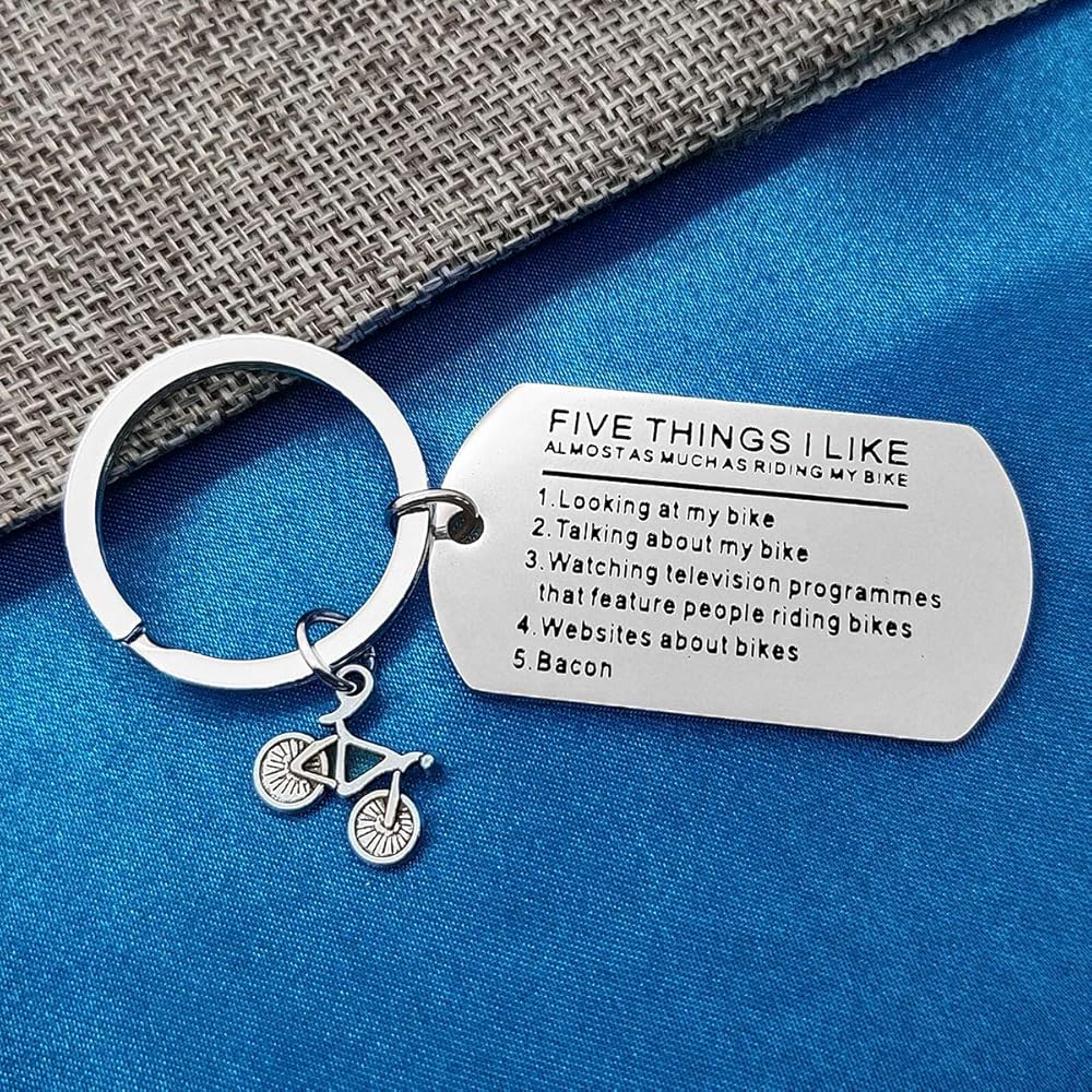 • 【Bicycle Funny Keychain】: Five Things I Like Almost As Much As Riding My Bike 1.looking at my bike 2.talking about my bike 3.watching television programmes that feature people riding bikes 4.websites about bikes 5.bacon.