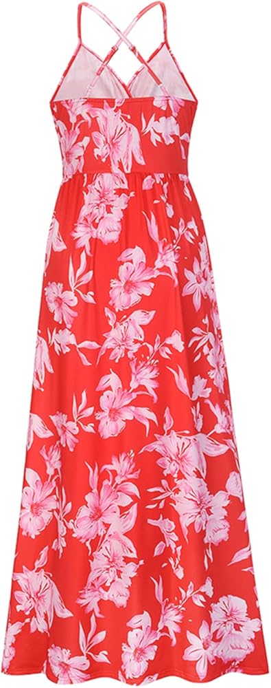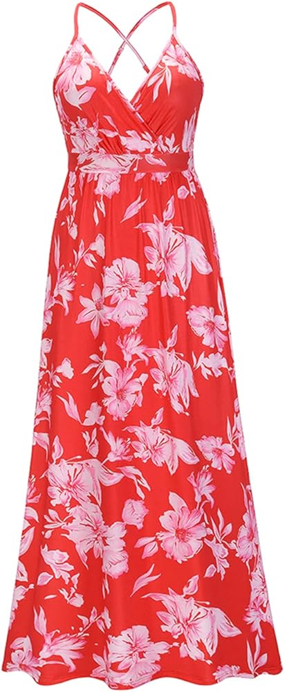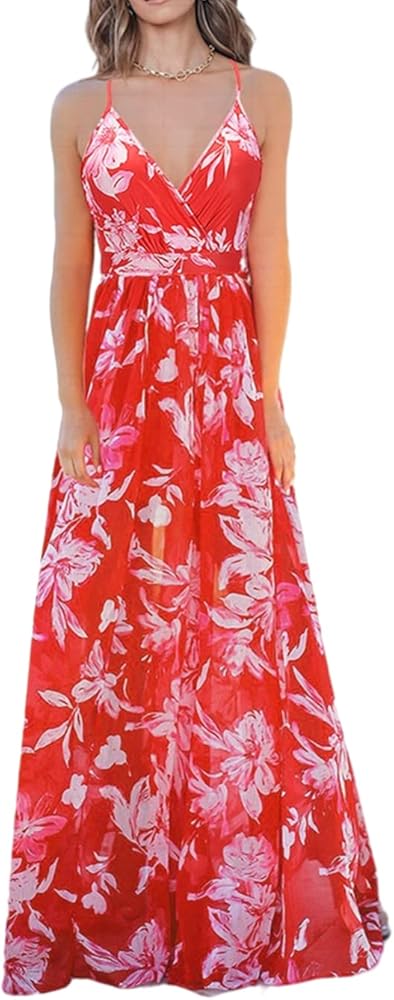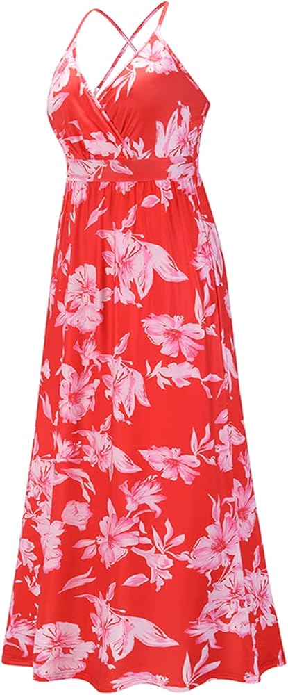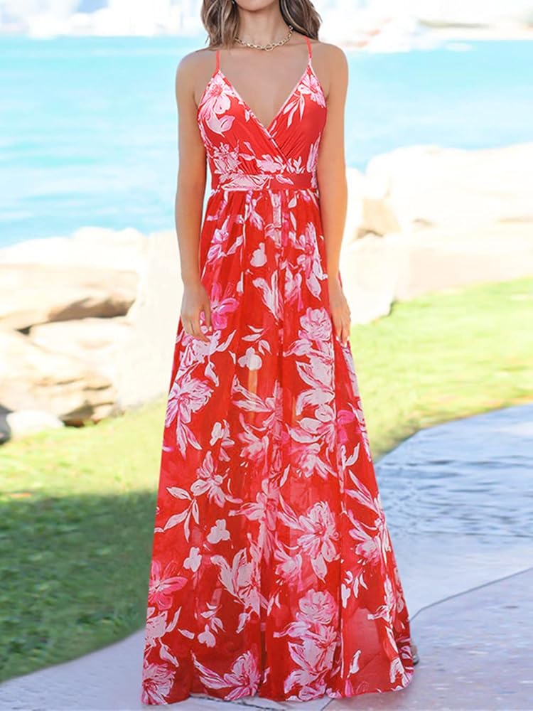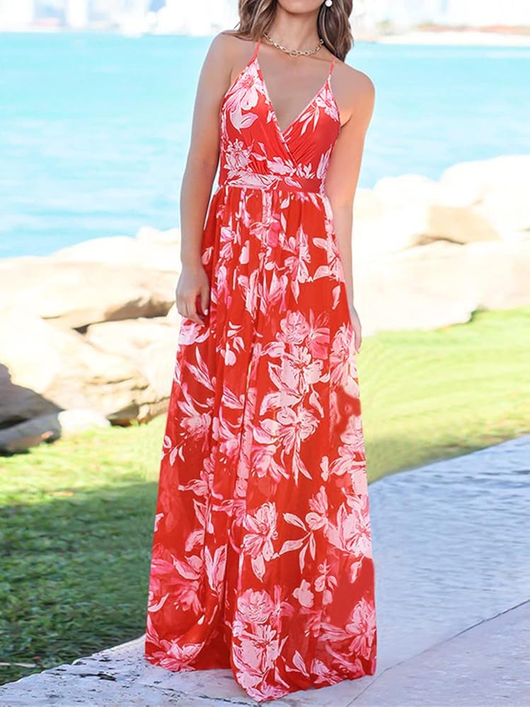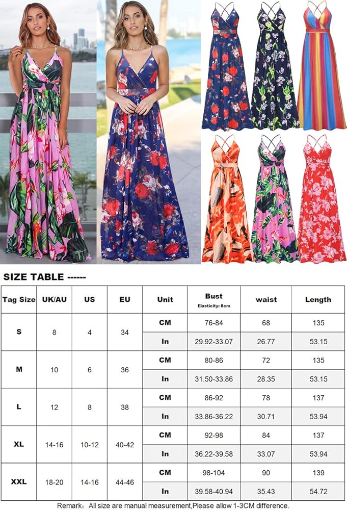المزايا: أشرطة سباغيتي قابلة للتعديل، تصميم مثير برقبة على شكل حرف V، طباعة زهور، مقاس فضفاض غير رسمي، طول يصل إلى الأرض، فستان طويل بخصر مرن إمبراطوري، فستان طويل طويل مزين بالزهور على الشاطئ