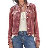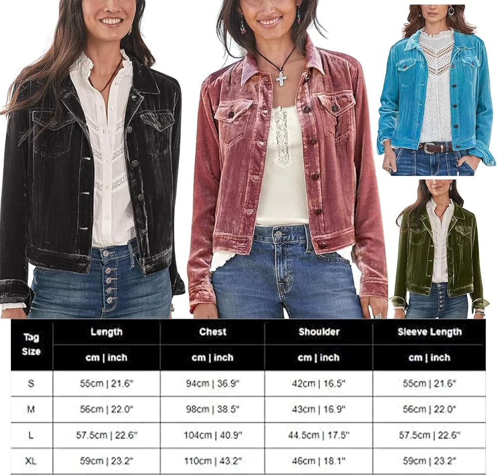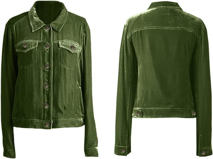 سترة نسائية مخملية كلاسيكية مع جيبين قلابين في الأمام، تصميم أساسي بلون ثابت. مصنوعة من مخمل ناعم وأملس ولامع.