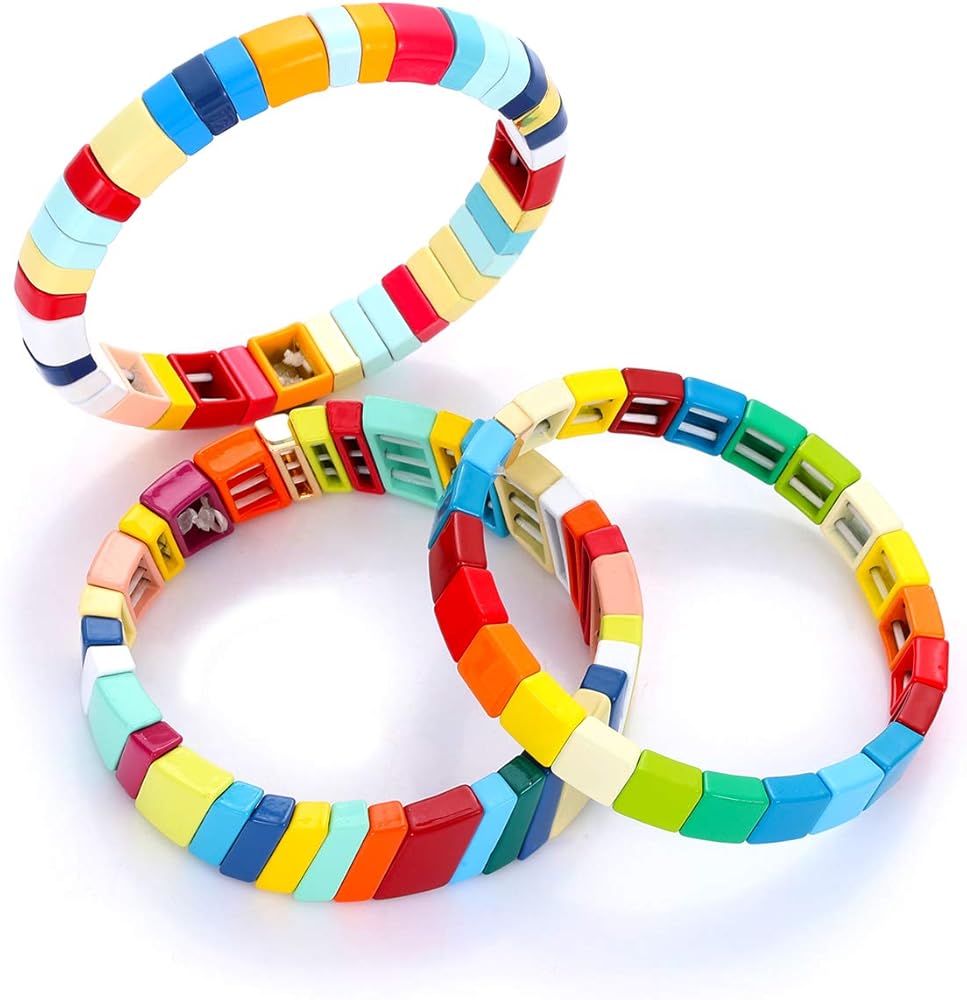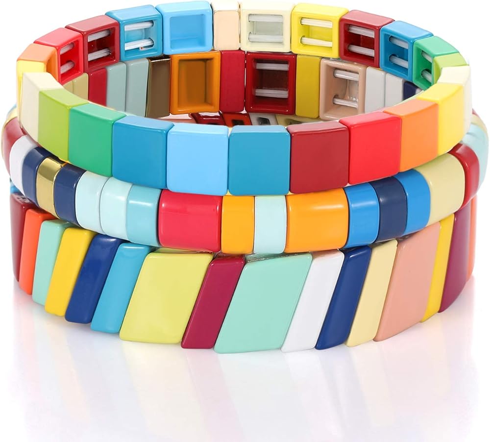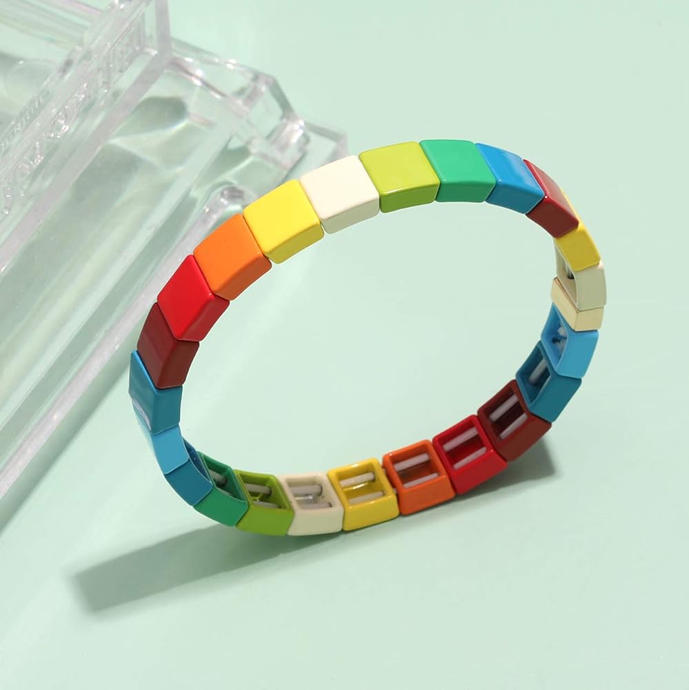 • Stackable Bracelet Set- These rainbow tile bracelets are perfect jewelry set suitable for various bracelet type, you can wear them separately or make them to be a suit up bracelet. The colorful enamel color block are stacked in an orderly manner, like a mosaic tile, which is very attractive.