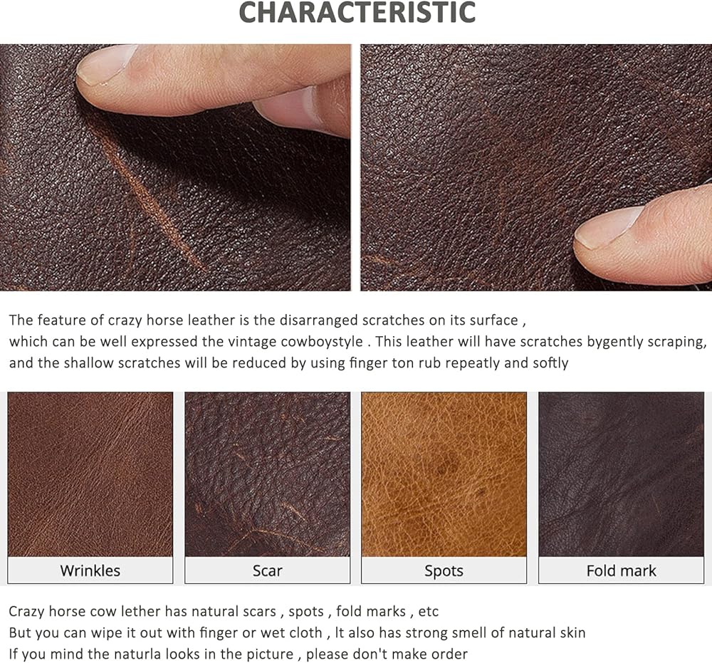 جلد كريزي هورس الأصلي الفاخر: محفظة جلدية محببة عالية الجودة، مصنوعة من جلد كريزي هورس الأصلي عالي الجودة من جلد البقر الإيطالي. جلد الحصان المجنون متين وقوي ويعطي مظهرًا وشعورًا فريدًا، فهو يجمع بين المظهر الفاخر والعتيق والعتيق. جلد المحفظة الخاص بنا معروف بنعومته وقدرته على الظهور بمظهر جيد مع مرور الوقت.