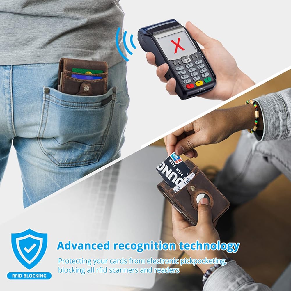 السلامة والخصوصية والأمان: محفظة النقود مزودة بتقنية RFID الآمنة المتقدمة، وهي مركب معدني فريد من نوعه، تم تصميمها خصيصًا لمنع إشارات RFID 13.56 ميجاهرتز أو أعلى لحماية بطاقات الائتمان RFID وبطاقات الخصم وبطاقات الهوية من الجيب الإلكتروني.