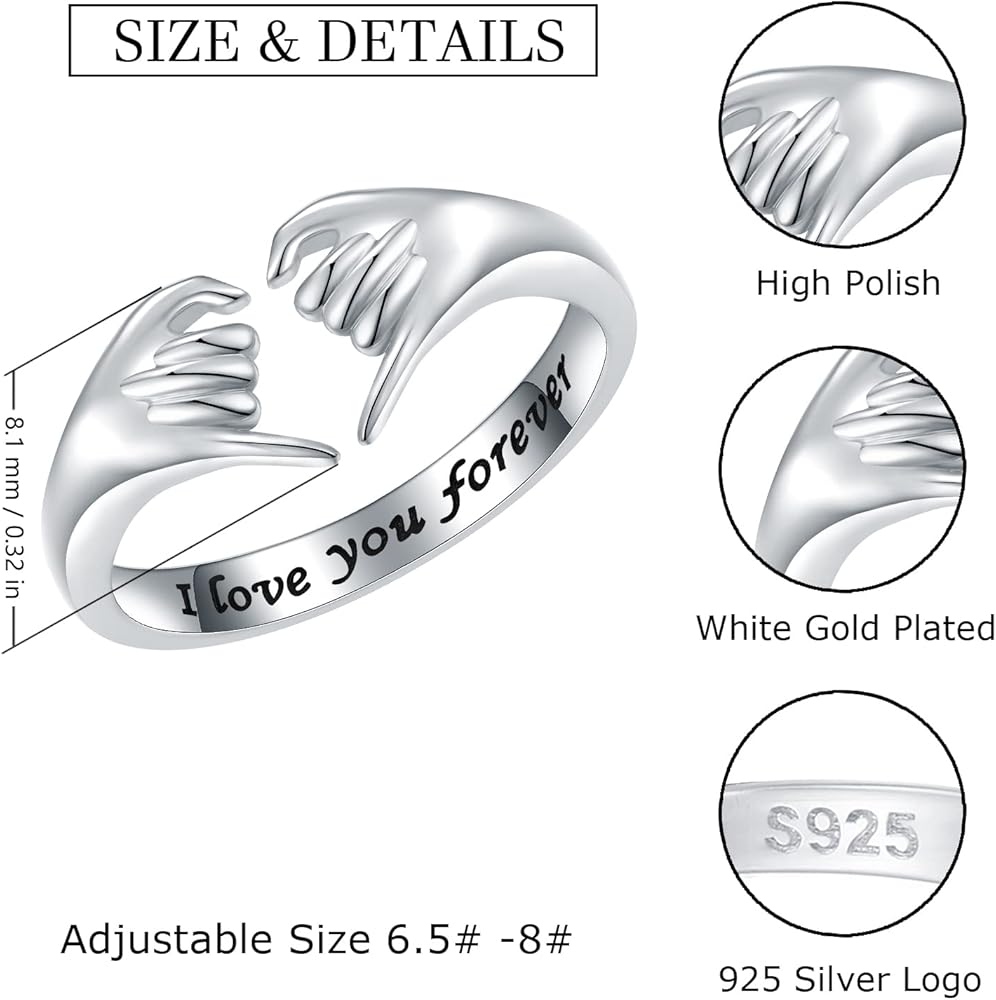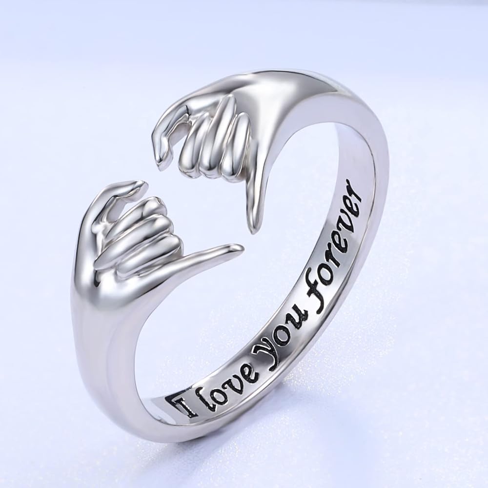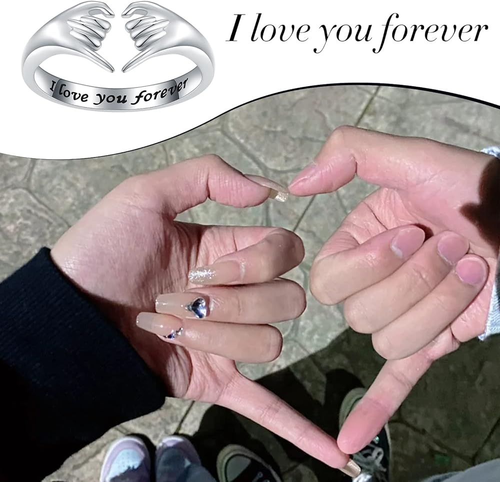 Silver Adjustable Heart Love Ring, I Love You With All Of My Heart: designed by a heart hand gesture, Heart represents Forever Love, Hands represent Friendship, with "I love you forever" engraved, it's symbol of forever love and friendship commitment. This adjustable hollow heart hand gesture ring is a modern, minimal and essential piece for everyday.