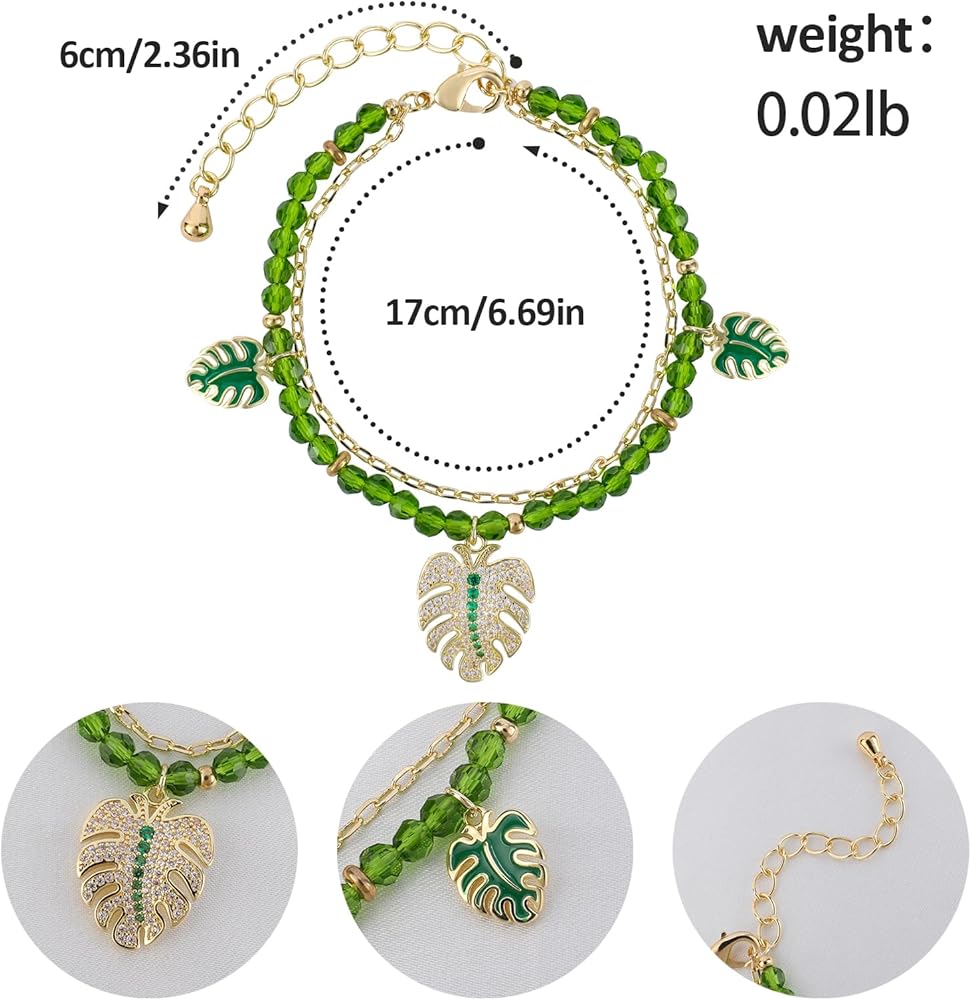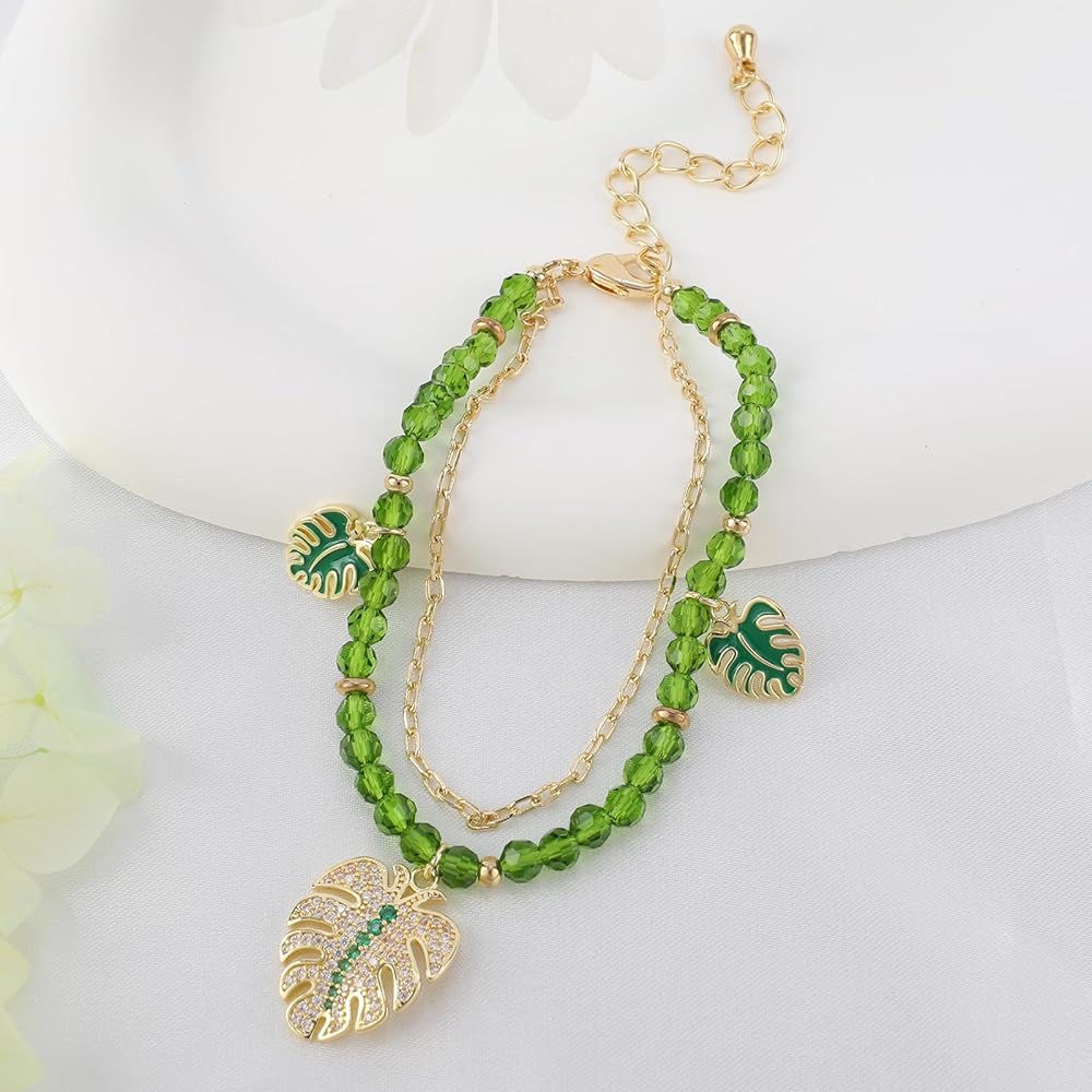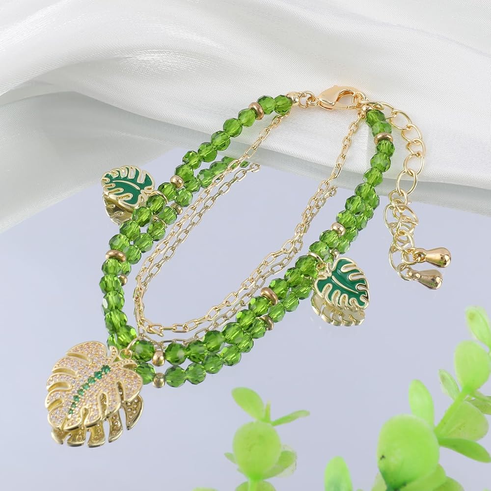 Monstera ليف سوار للنساء طبقة مزدوجة الأخضر مطرز Monstera أوراق النخيل سوار الذهب سلسلة قابل للتعديل موضوع الغابة سوار مع قلادة أوراق النخيل لذيذ للفتيات في سن المراهقة هدية عيد الميلاد المجوهرات
