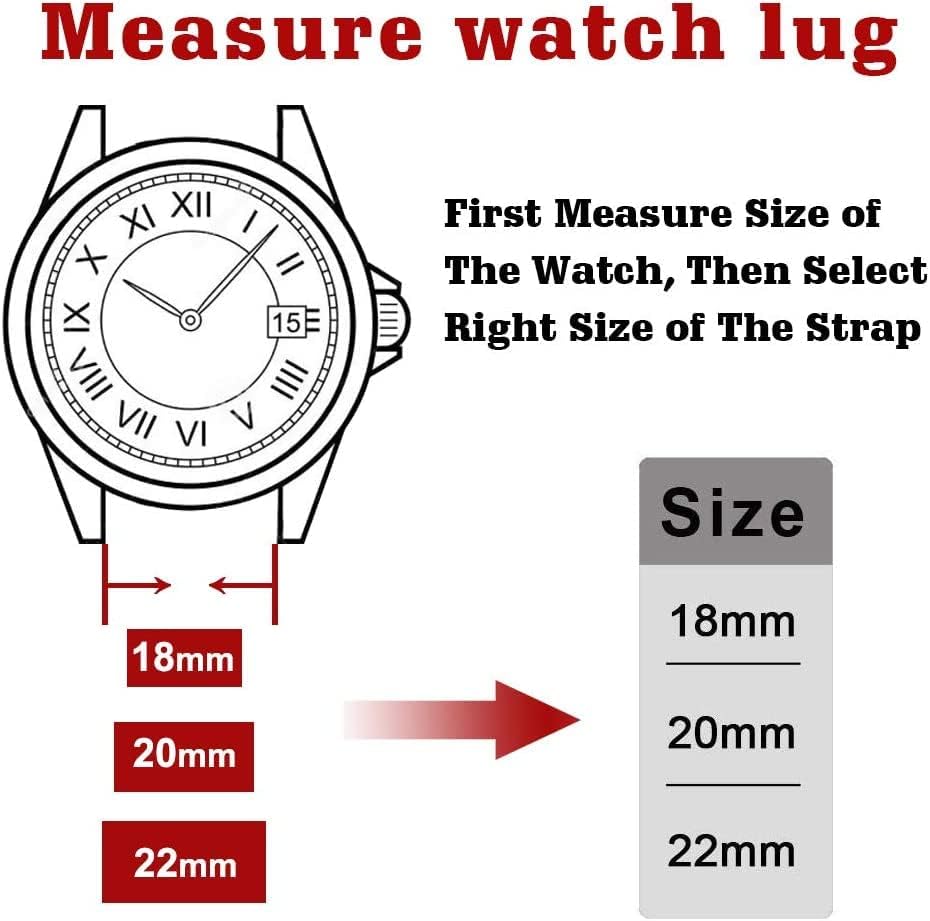ملاءمة مثالية - يبلغ طول جميع العروض (18 مم، 20 مم، 22 مم) حوالي 10.5 بوصة (265 مم) ولا يشمل الإبزيم ويناسب محيط المعصم من 5 بوصات إلى 8 بوصات. إذا كان هذا الحزام أطول من المطلوب في البداية، قم بطي الطرف الحر بشكل أنيق مرة أخرى في حلقة الحافظة أو قصه إلى الطول المطلوب. إذا تم تشذيبه، قم بكشف الطرف المقطوع لمطابقة أو لهب أخف لتجنب الاهتراء.