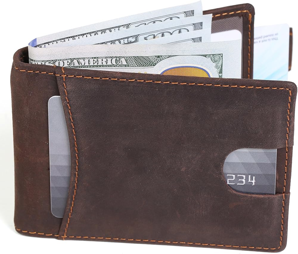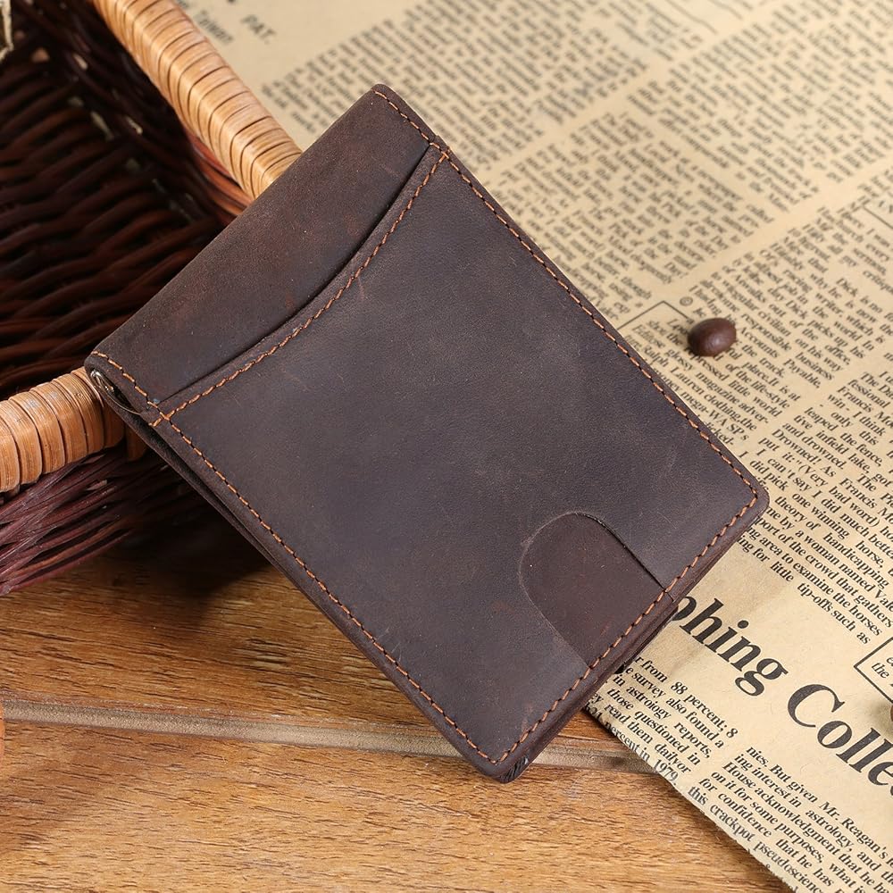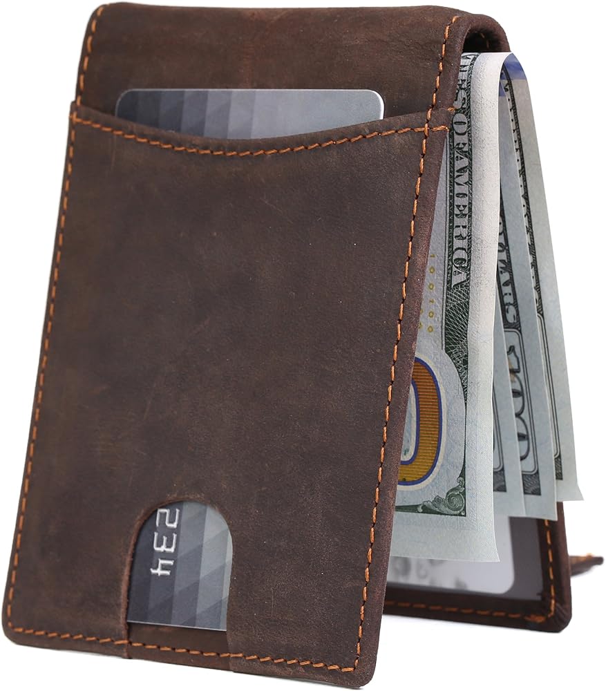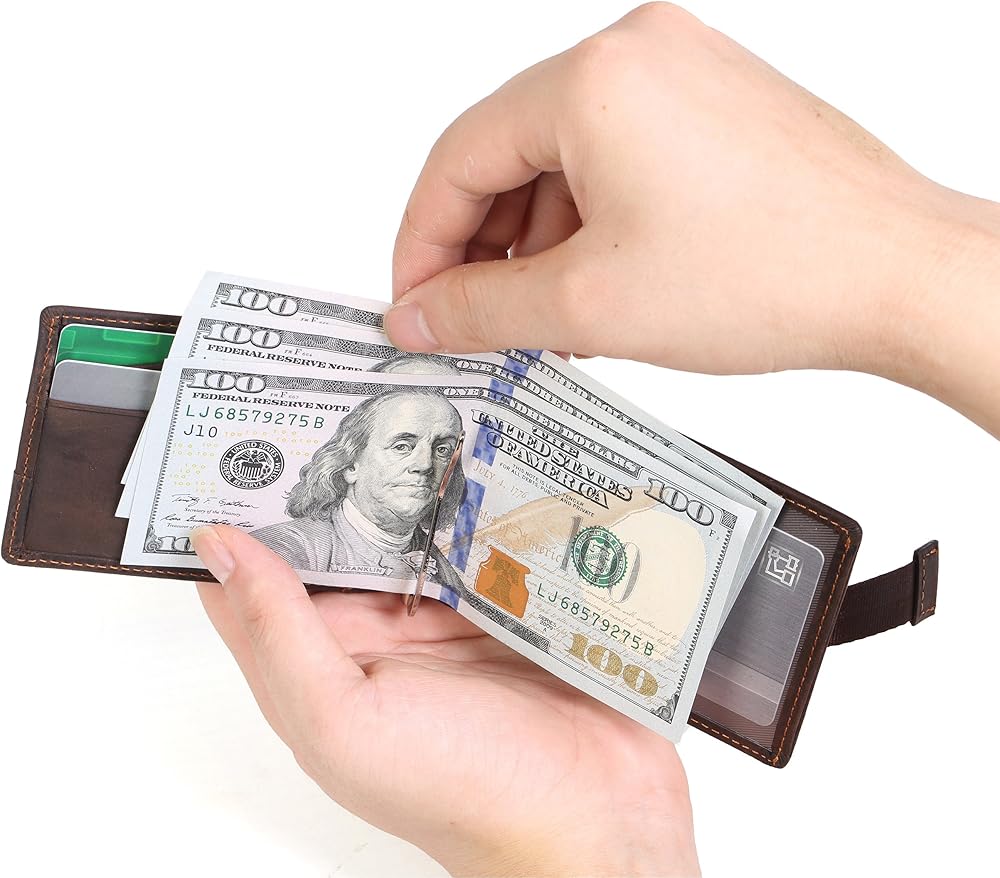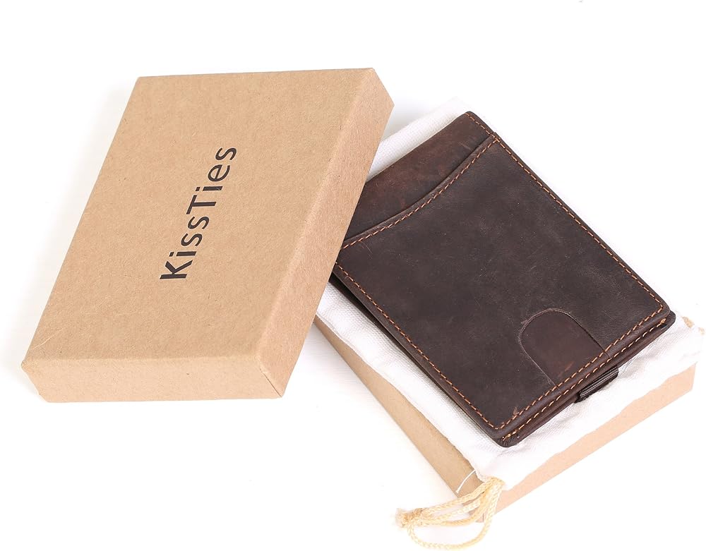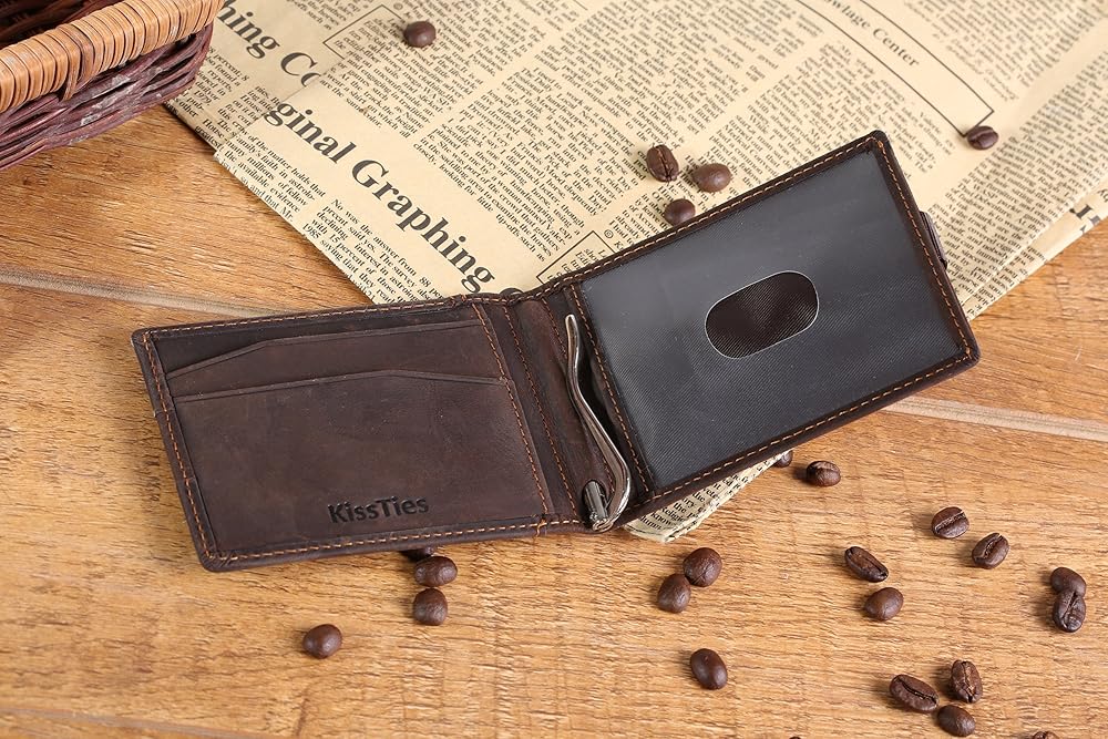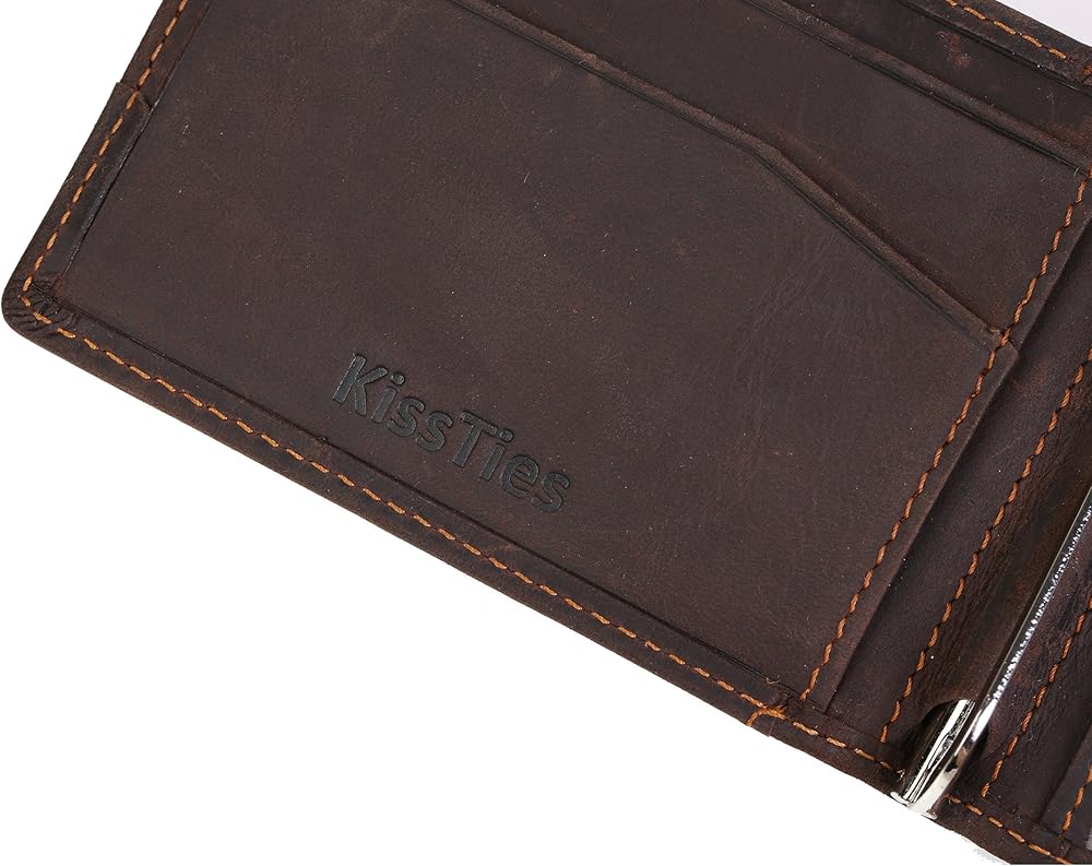 محفظة KissTies Top Grain الجلدية الرقيقة ثنائية الطي تحتوي على 4 فتحات للبطاقات، 1 نافذة عرض الهوية، 1 مشبك نقود للنقود، هذه المحفظة سهلة الاستخدام رفيعة ومتينة ومصنوعة بشكل جيد وبحد أدنى كما يحتوي جراب المحفظة على حزام سحب ذكي من أجل الوصول السريع إلى بطاقاتك اليومية. مع فتحة الإبهام، من السهل إزالة بطاقة الهوية/رخصة السائق من نافذة الهوية. إنها رفيعة، ليست كبيرة، مثالية للأشخاص الذين يبحثون عن محفظة رفيعة وصغيرة لحمل المال والبطاقات.