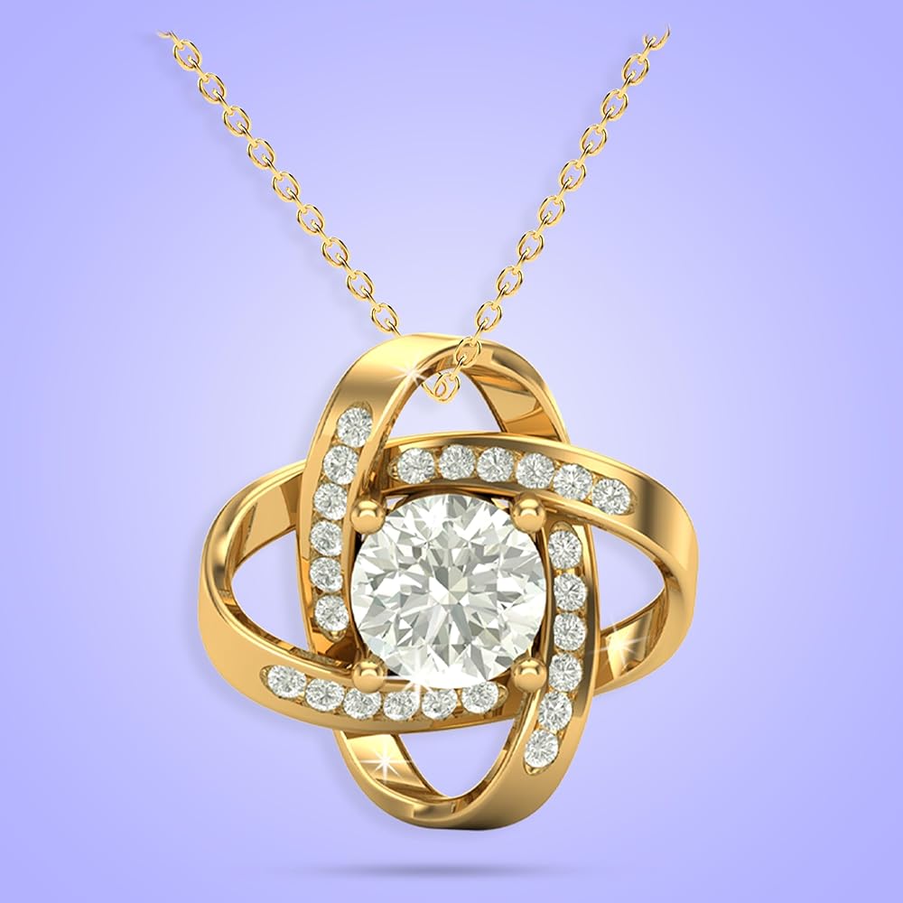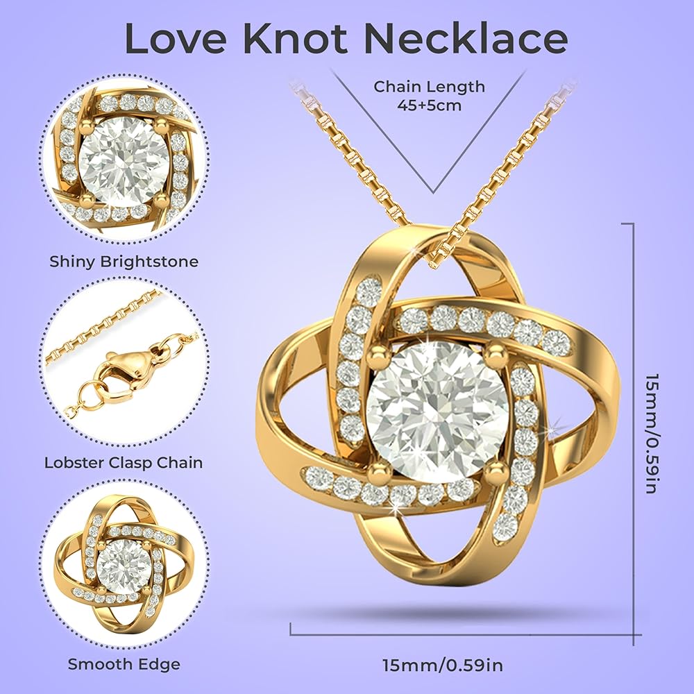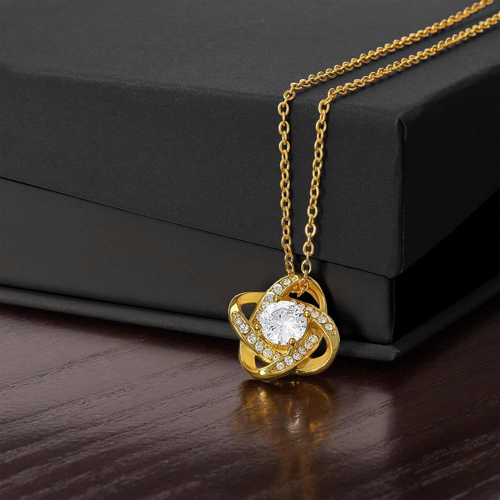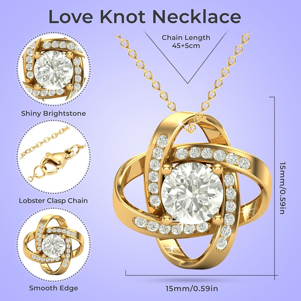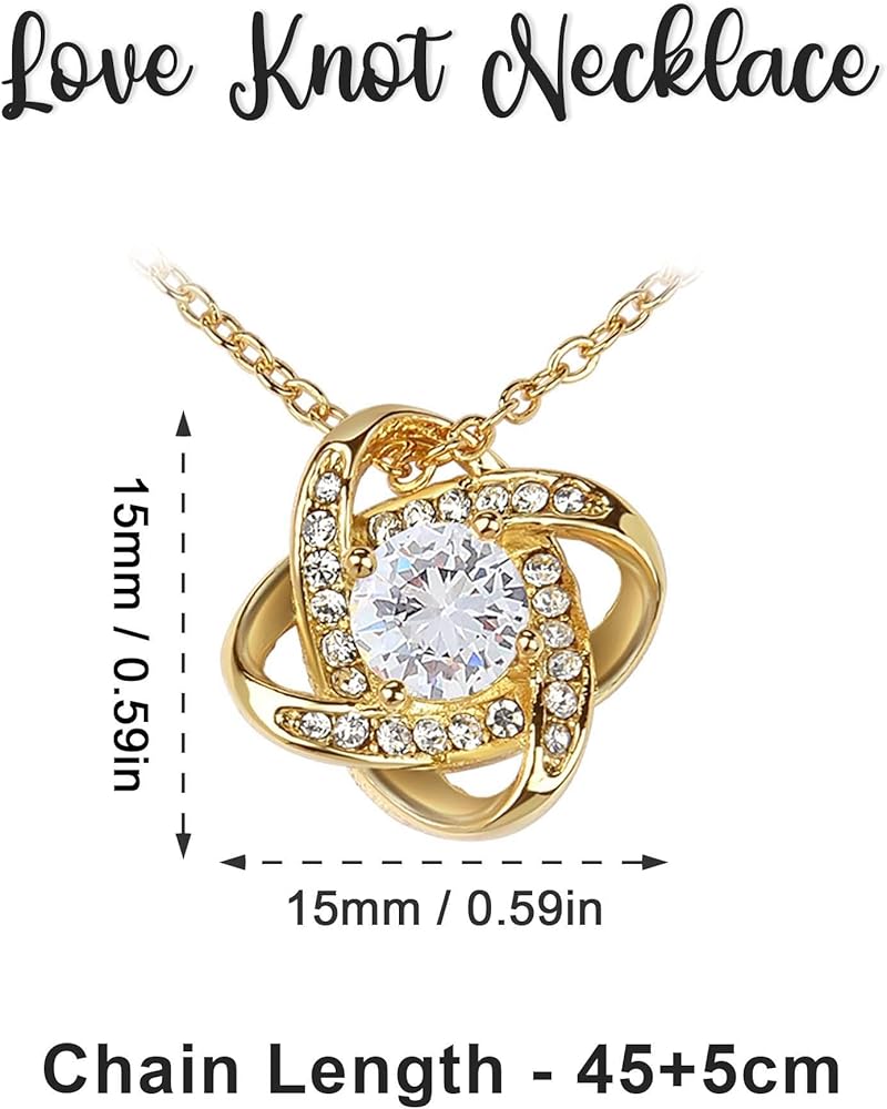 Imagine her reaction receiving this beautiful Love Knot Necklace. Representing an unbreakable bond between two souls, this piece features a beautifully woven pendant embellished with premium CZ stones. Choose between either a luxurious 14k white gold finish or a timeless 18k gold finish to complete the look. Surprise your loved one with this gorgeous gift today! 14k white gold or 18k yellow gold over stainless steel 6mm round cut cubic zirconia stone Pendant dimensions: 0.6" (15.7mm) height / 0.23" (6mm) width Adjustable chain length: 18" - 22" (45.72cm - 55.88cm) Lobster clasp attachment Your piece is lovingly packaged in a complimentary soft touch box for easy gifting. Elevate your presentation by upgrading to the mahogany style luxury box, which features a brilliant LED spotlight.