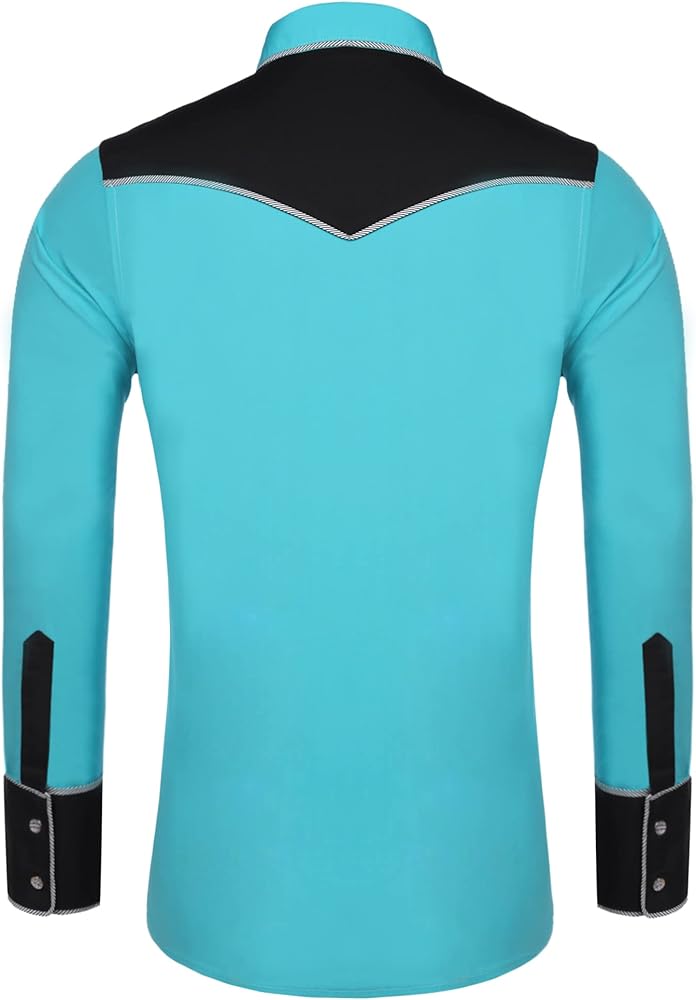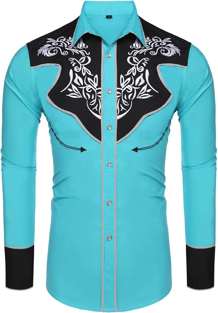 CLASSIC UNIQUE WEST EMBROIDERY DESIGN--This long sleeve cowboy button down shirt features exquisite embroidery on front yokes, contrast color, button down closure, chic golden button, Decorated striped edge, and no pocket design, give you traditional and old fashioned look.