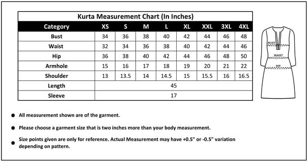 - مقاس صدر كورتا:: 36 بوصة | طول كورتا:: 44 بوصة | أكمام كورتا:: 17 بوصة