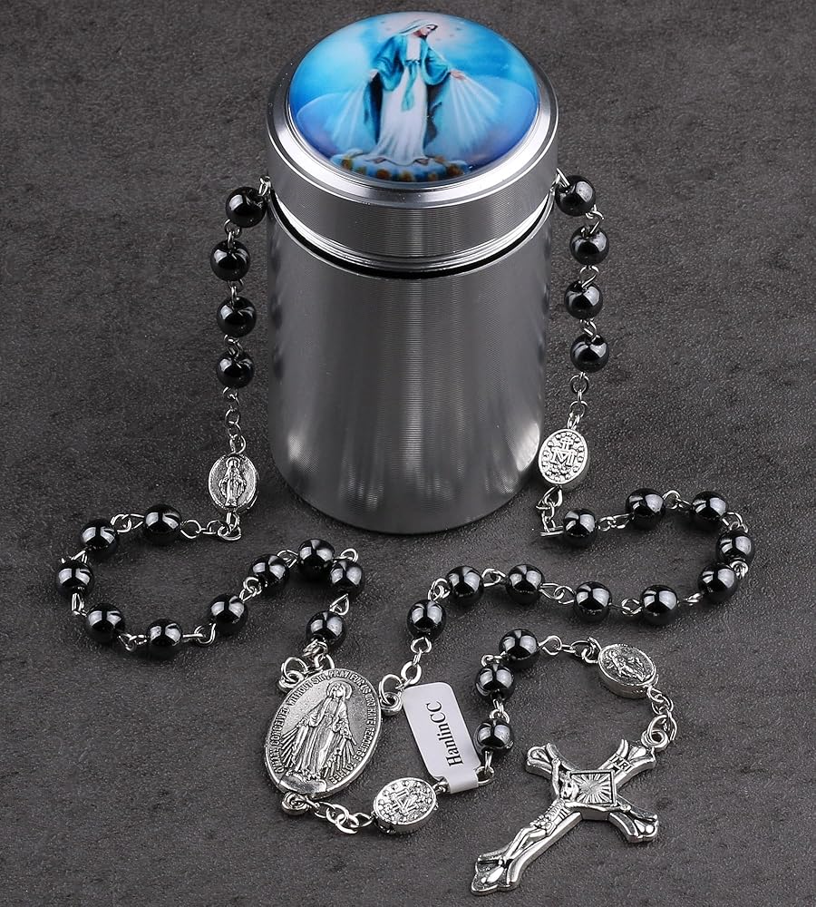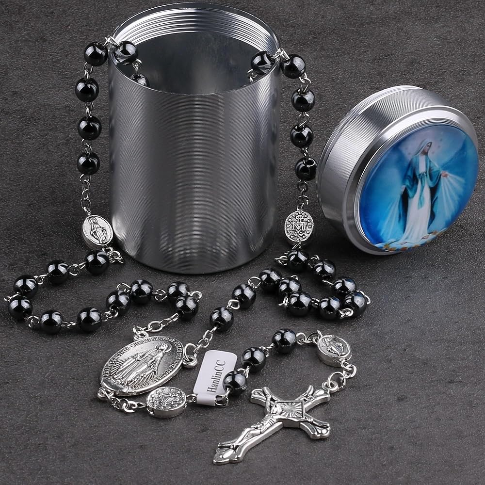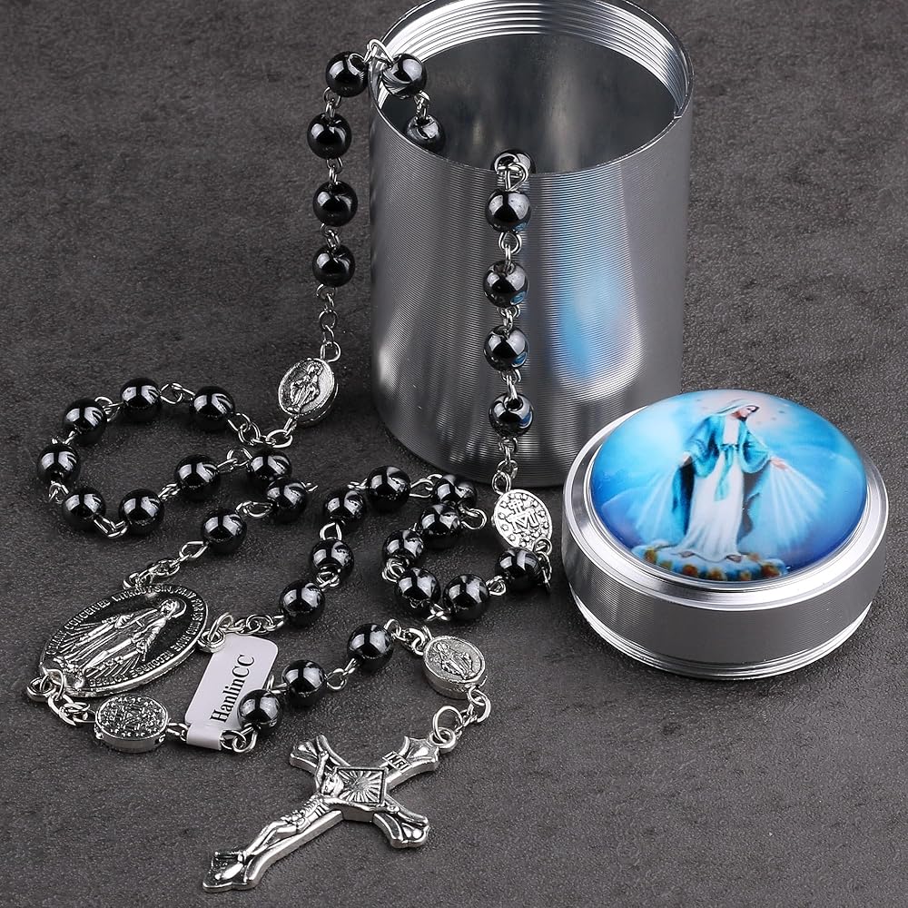 قلادة مسبحة سانت مايكل الكاثوليكية من حجر الهيماتيت الأسود من HanlinCC مع صندوق هدايا، إنها هدية جيدة لأصدقائك وحبيبك وأطفالك وعائلتك، من أجل المناولة الأولى أو التشكل أو الصلاة...