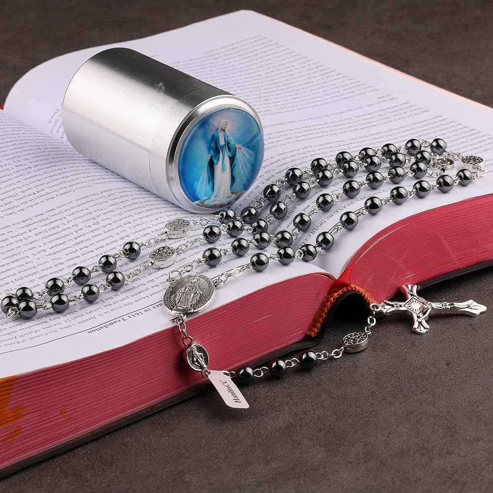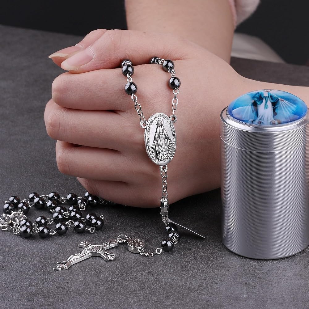 قلادة مسبحة سانت مايكل الكاثوليكية خرزات هيل ماري مقاس 6 ملم خرز دائري من حجر الهيماتيت، خرزات ابونا مصنوعة من خرز سانت مايكل معدني مطلي ضد الفضة، مما يجعل المسبحة تبدو جميلة ويمكنك الصلاة وعينيك مغمضتين وتعرف لقد وصلت إلى نهاية العقد ويمكنك التأمل في سر المسبحة التالي.