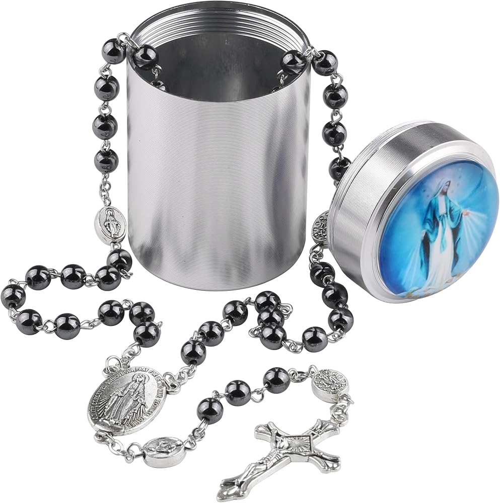 كل مجموعة من قلادة مسبحة سانت مايكل في صندوق هدايا معدني فضي، مع كابوشون زجاجي بصورة سانت مايكل على غطاء الصندوق، يبدو الصندوق جميلاً وقويًا لحماية المسبحة في حالة جيدة لفترة طويلة؛ الصندوق صغير بما يكفي لوضعه في الجيب وإحضاره إلى كل مكان، مع صندوق المسبحة هذا لا داعي للقلق بشأن فقدان المسبحة مرة أخرى.