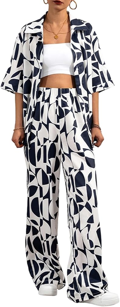 ملابس مكونة من قطعتين: ملابس نسائية مكونة من قطعتين، قميص بأكمام قصيرة بأزرار سفلية، سراويل طويلة، خصر مرتفع، جيبين، مقاس فضفاض، مجموعة ملابس صيفية يجب اقتناؤها في خزانة ملابسك!