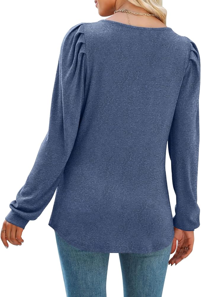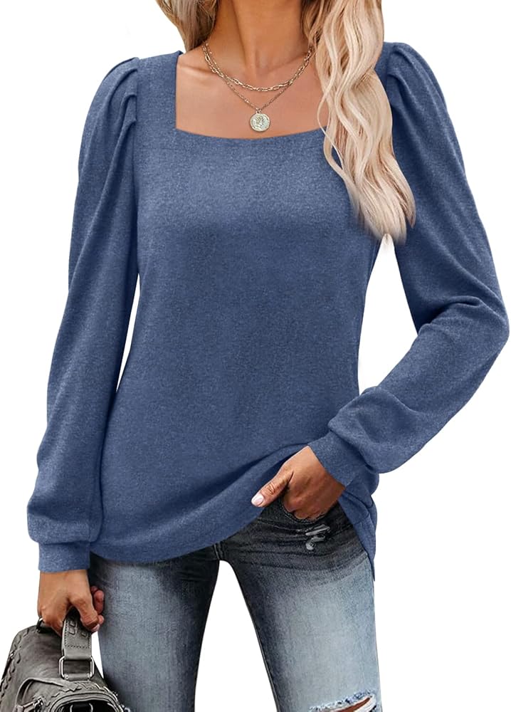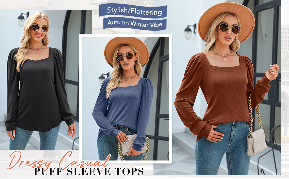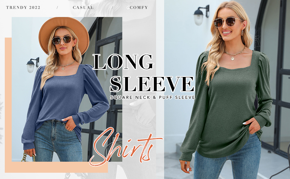 تي شيرتات كاجوال برقبة مربعة، قمصان علوية أنيقة منتفخة بأكمام طويلة مع تصميم كتف مكشكش، حاشية منحنية، مقاس فضفاض، قمصان نسائية جذابة جدًا