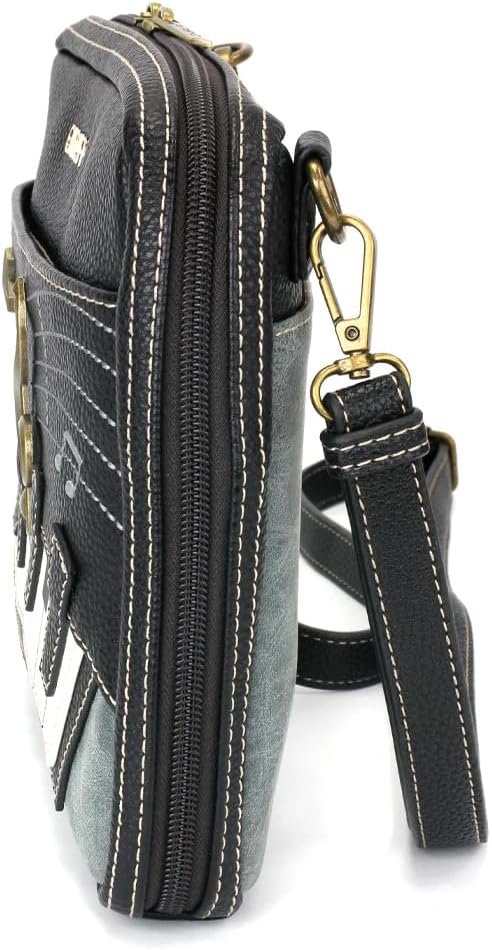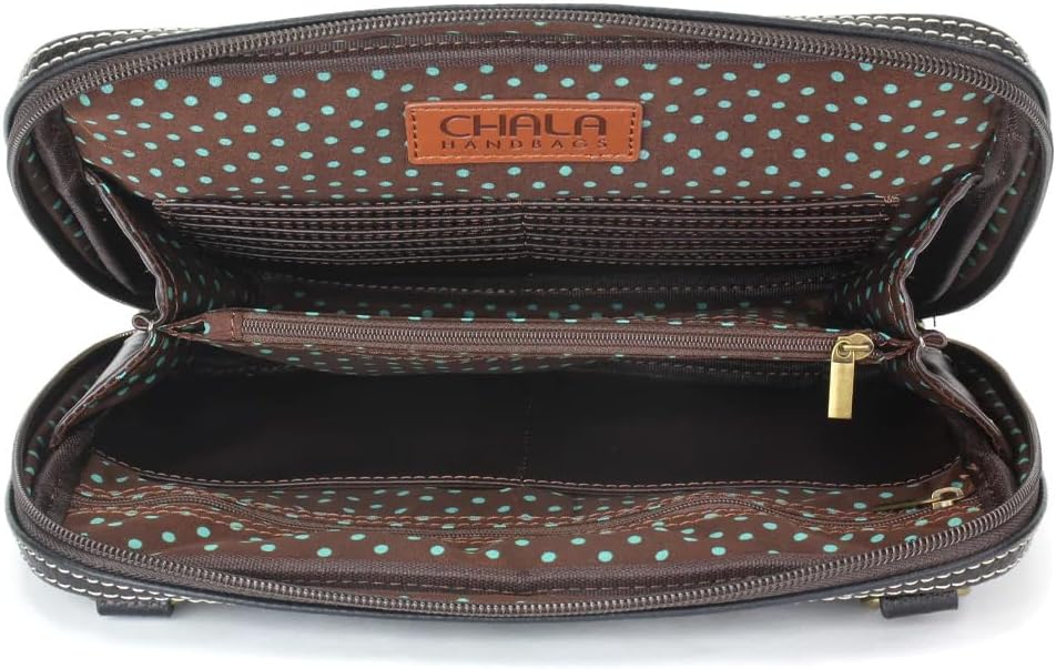تصميم بيانو تشالا بال مصنوع بعناية ومفصلة، جيب رئيسي بسحاب يحتوي على سحابين ويفتح على نطاق واسع، فتحات متعددة لبطاقات الائتمان لكل من العملات المعدنية والنقود، يناسب أجهزة ايباد وأجهزة التابلت الصغيرة، جيوب داخلية منزلقة وسحاب تحافظ على الأشياء منظمة، جيب خلفي منزلق للراحة، جيب أمامي بسحاب لتخزين إضافي، شعار تشالا المميز بأجزاء صلبة نحاسية عتيقة، المواد: جلد صناعي، اللون: نيلي تقريبًا. القياسات: 10"W x 8" H x 1.5" D حزام قابل للتعديل: 16.5"-31" مصمم في كاليفورنيا، الولايات المتحدة الأمريكية