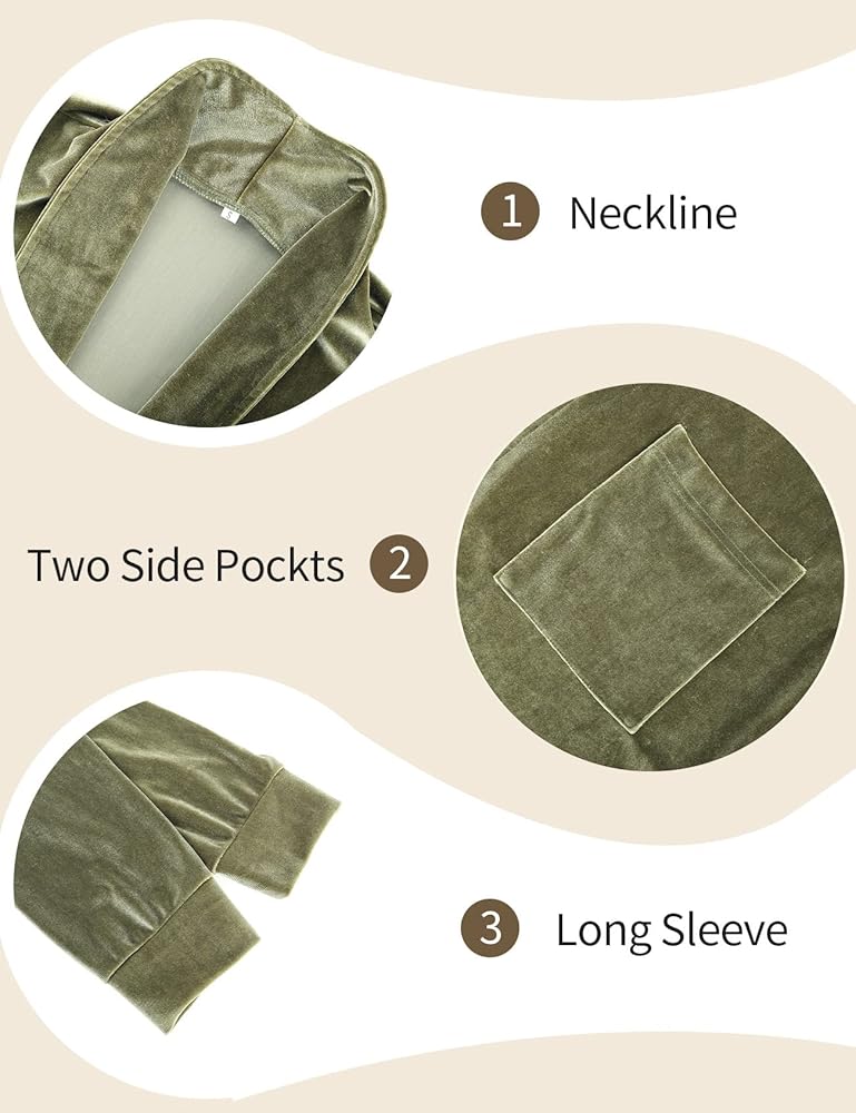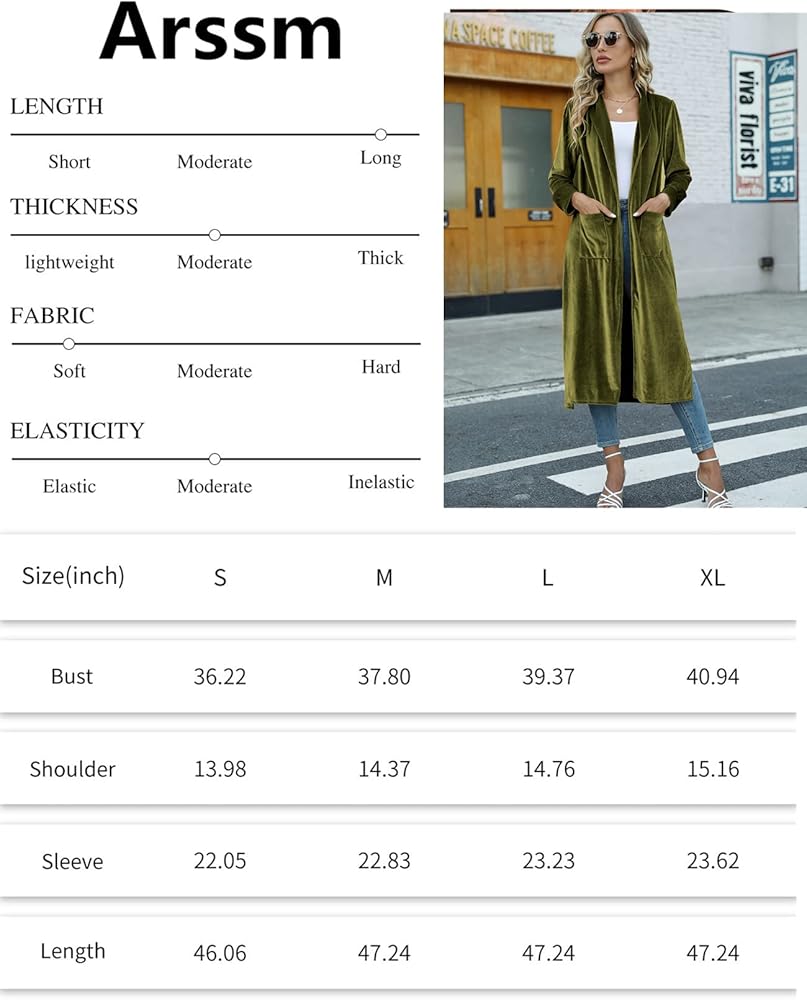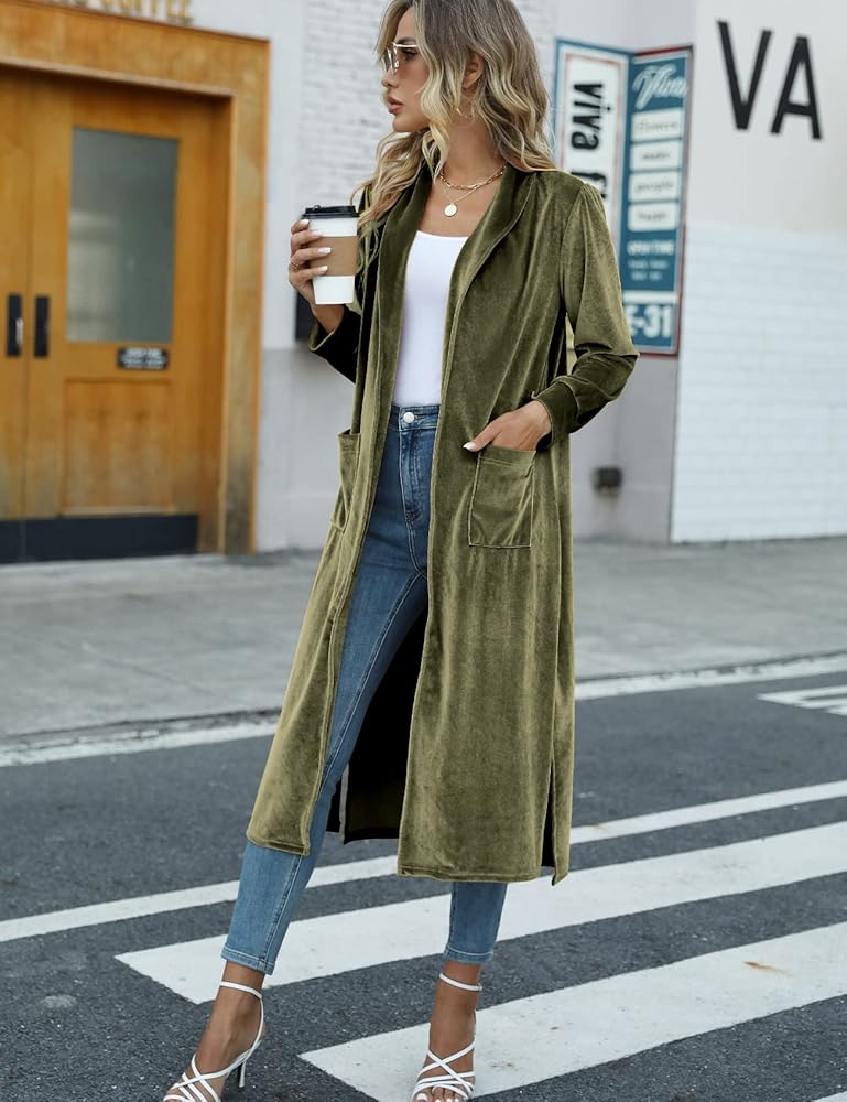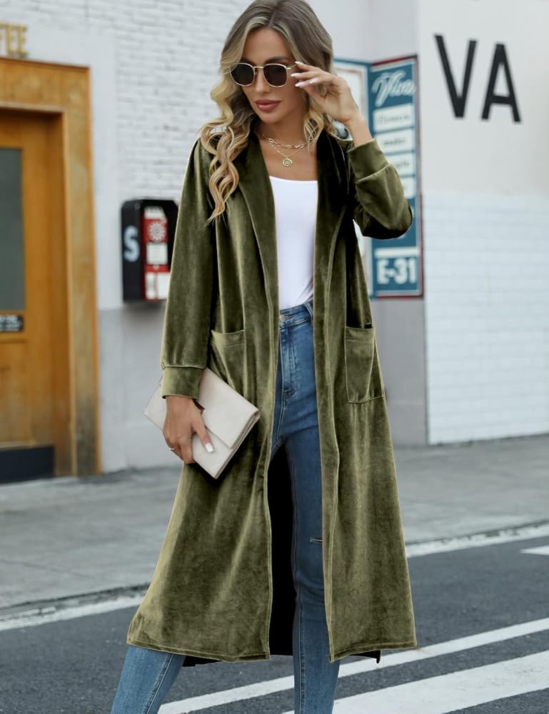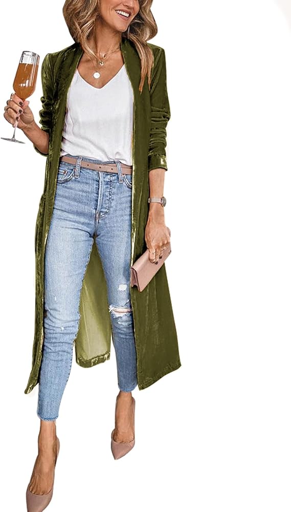 بليزر كاجوال مخملي للنساء مصمم بنمط مفتوح من الأمام وأكمام طويلة وطول ماكسي