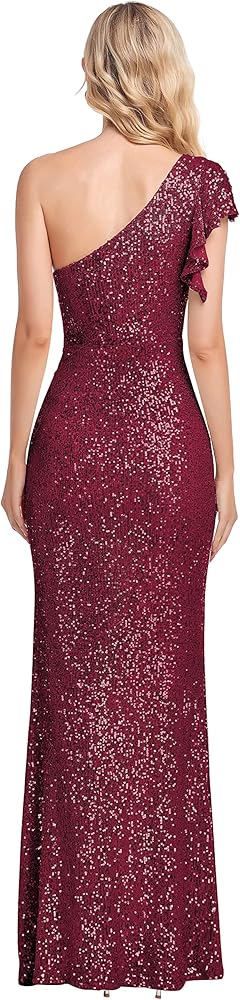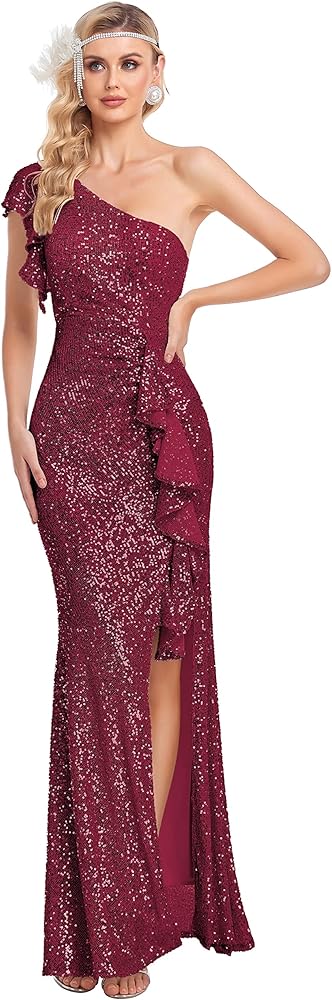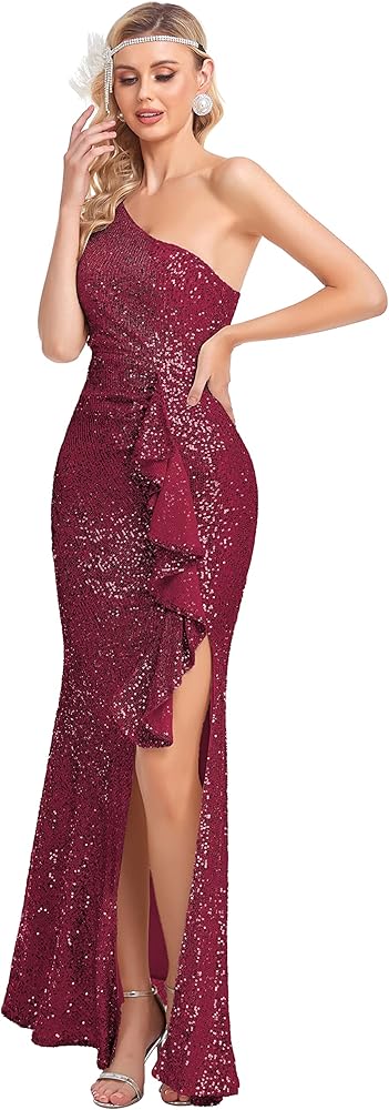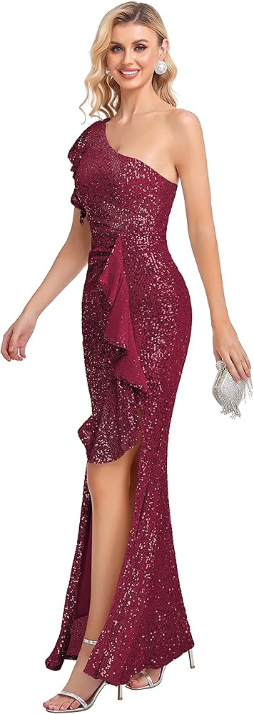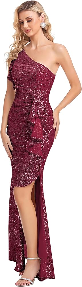 تصميمات فريدة من نوعها: من السهل تحقيق مظهر أنيق يلتقي بالأناقة في فستان حورية البحر المكشكش بكتف واحد والترتر اللامع! نسيج مطرز بالترتر متوسط الوزن ومطاط يشكل هذا الفستان الأنيق بأكمام ذات طبقات وكشكشة بكتف واحد مما يخلق خط عنق غير متماثل ثم يحمل في الصدرية المنقطقة. يتدفق الخصر المرتفع والمجهز إلى تنورة طويلة مبهجة مع حاشية حورية البحر الواسعة. سحاب/مشبك جانبي مخفي.