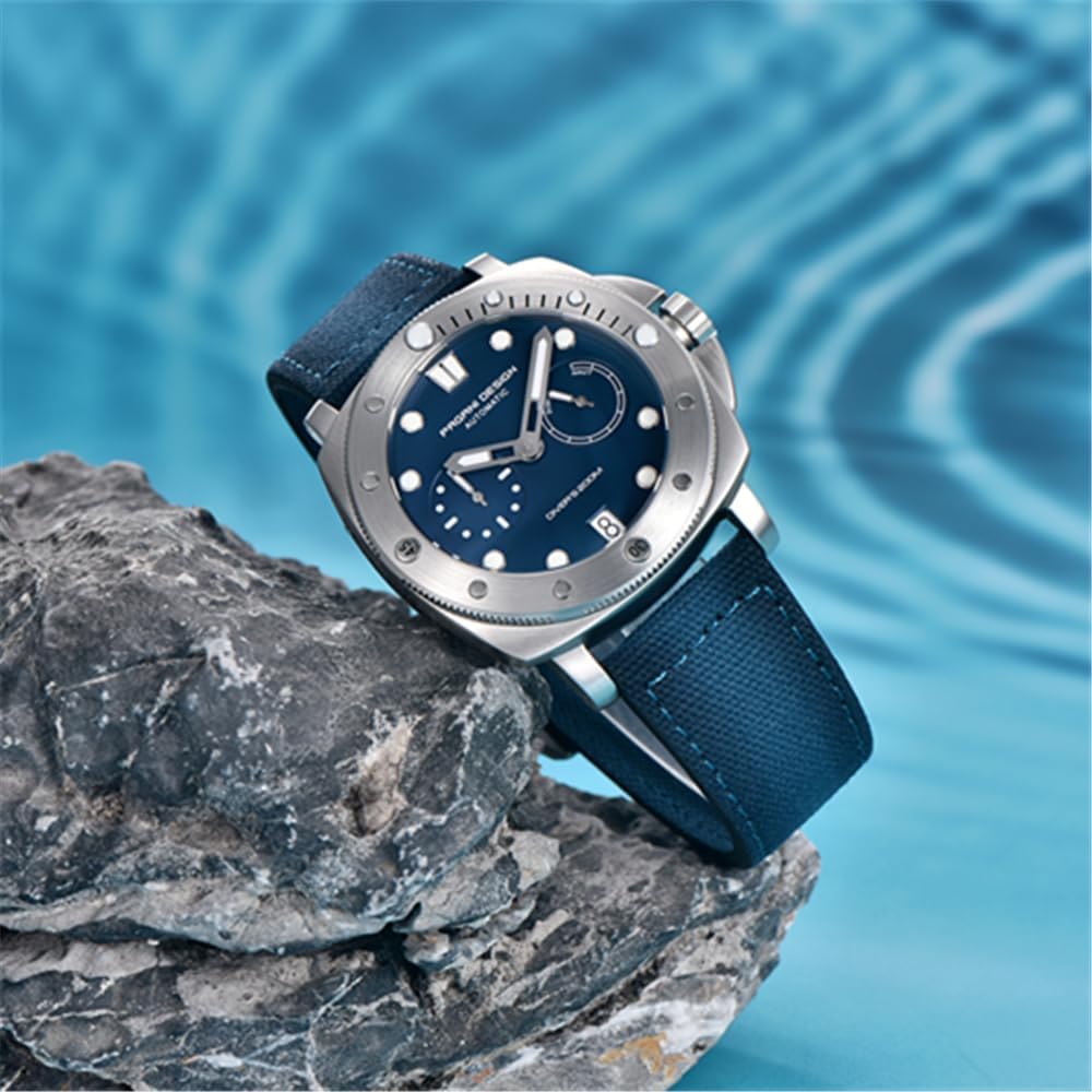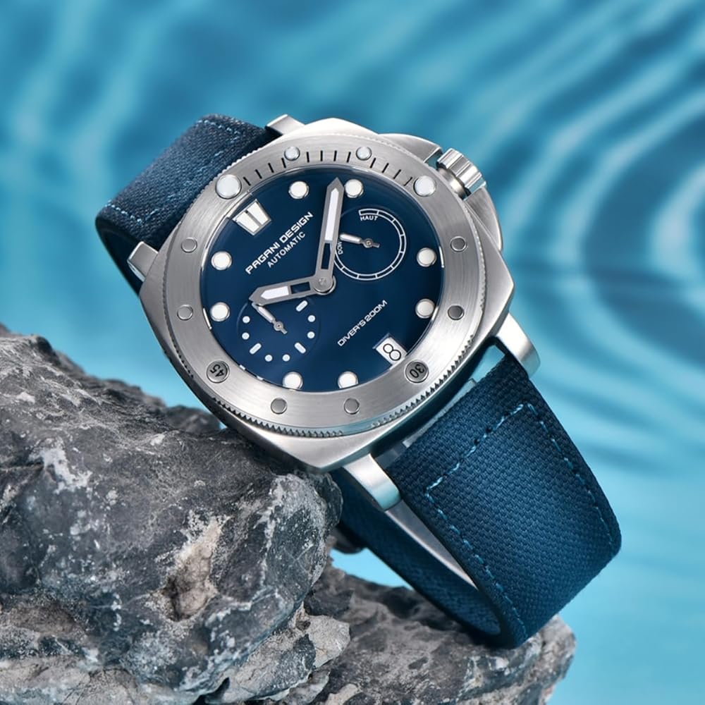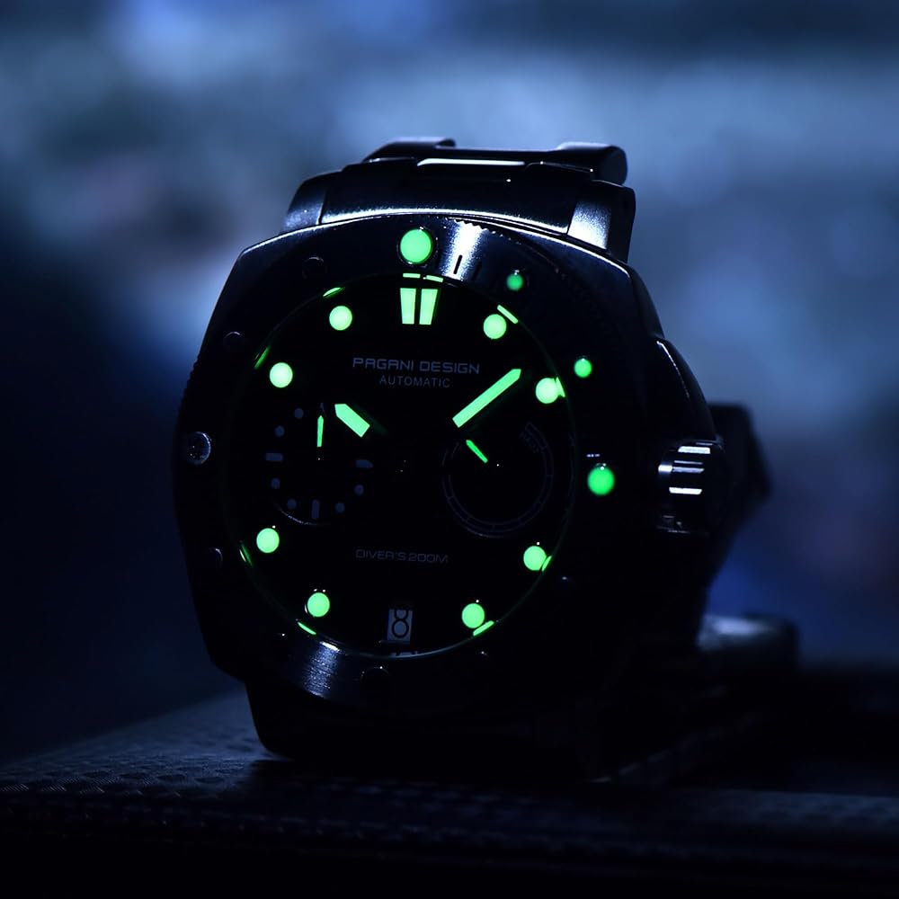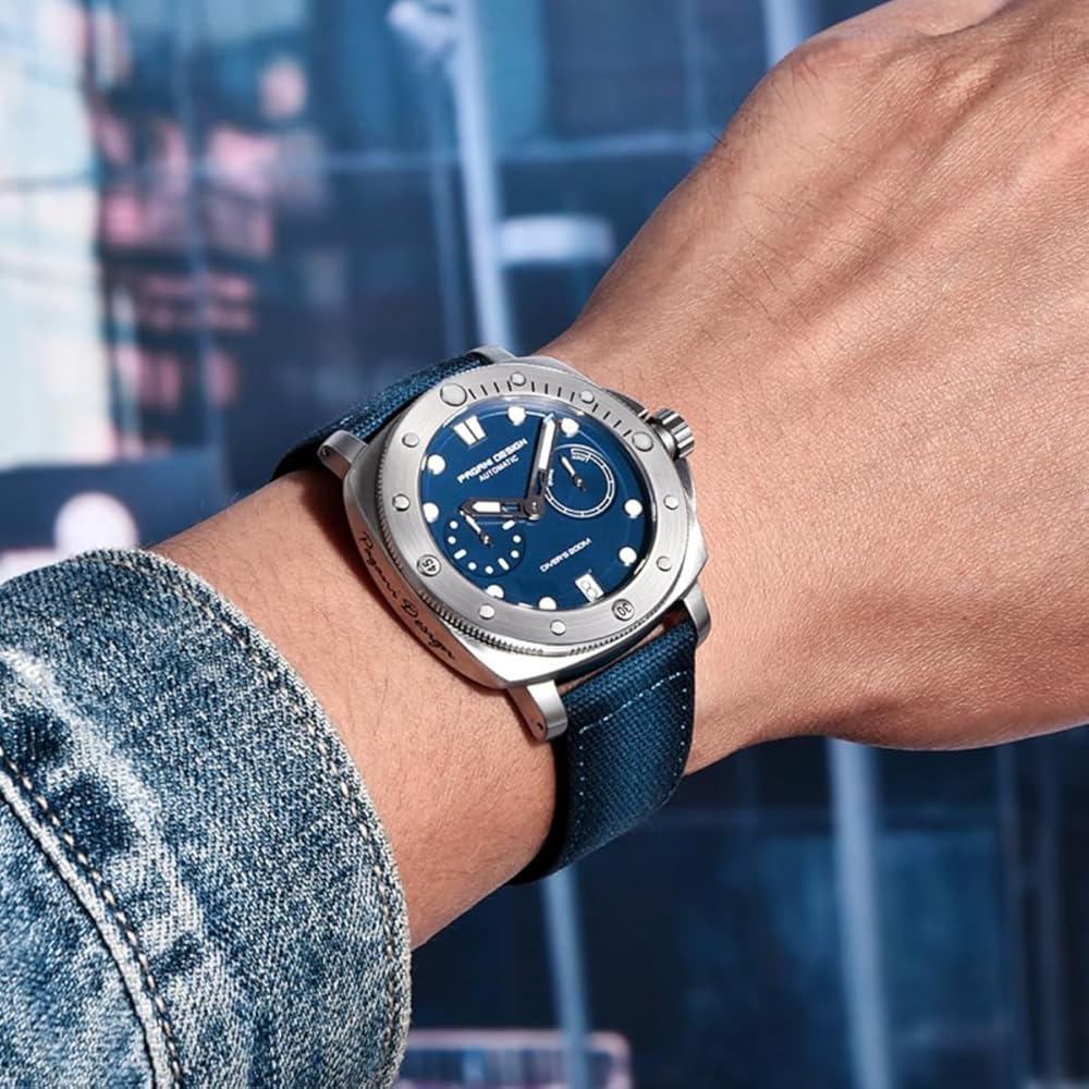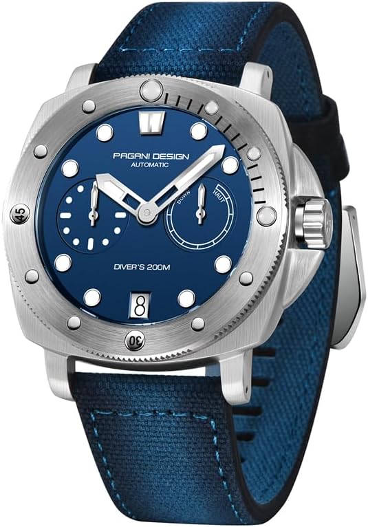 ساعة كلاسيكية للرجال: مرآة الساعة مصنوعة من زجاج الياقوت ومجهزة بإطار دوار في اتجاه واحد بزاوية 360 درجة. يحتوي الإطار على أخاديد تروس، مما يجعل الساعة أكثر ميكانيكية. يبلغ قطر القرص 41 ملم، وهو حجم متوسط جدًا. تتميز عقارب الساعة ومقاييسها بطبقة مضيئة، مما يسمح لك برؤية الوقت بشكل أفضل. العلبة مصنوعة من الفولاذ الدقيق 316L، وجانب العلبة مطبوع بشعار PAGANI DESIGN الفريد